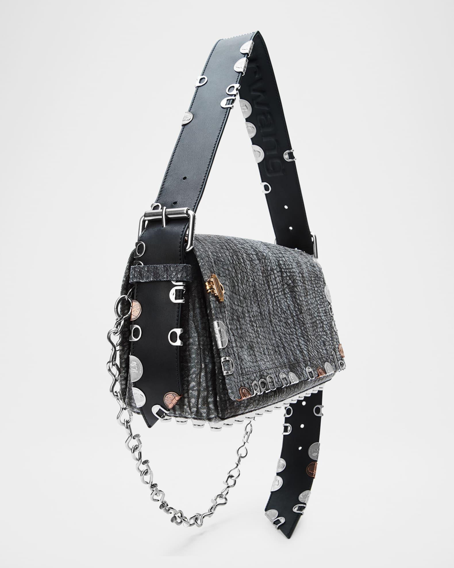 Alexander Wang "Ricco Rogue" medium shoulder bag in faded cotton denim and leather, detailed with folded coins, can tabs, and keys for a contemporary, bohemian touch Fixed chain strap Adjustable leather shoulder strap Flap top with magnetic closure Signature studs on the bottom of the bag Lining: Cotton Approx. 7"H x 12.5"W x 4.5"D Imported