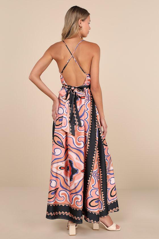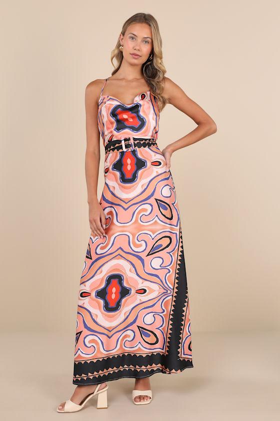 We can see you sipping ice cold bevs on a yacht in the Lulus Rich Demeanor Pink Multi Abstract Backless Buckle Maxi Dress! An abstract design (in hues of pink, ivory, blue, black, and red) adorns sleek woven satin as it shapes a cowl neckline and a fitted bodice, supported by adjustable spaghetti straps that crisscross the otherwise open back. A sash belt, with a covered square buckle detail, accents the high waist that tops a flowy, A-line skirt with a chic maxi hem. Elastic at back for fit.