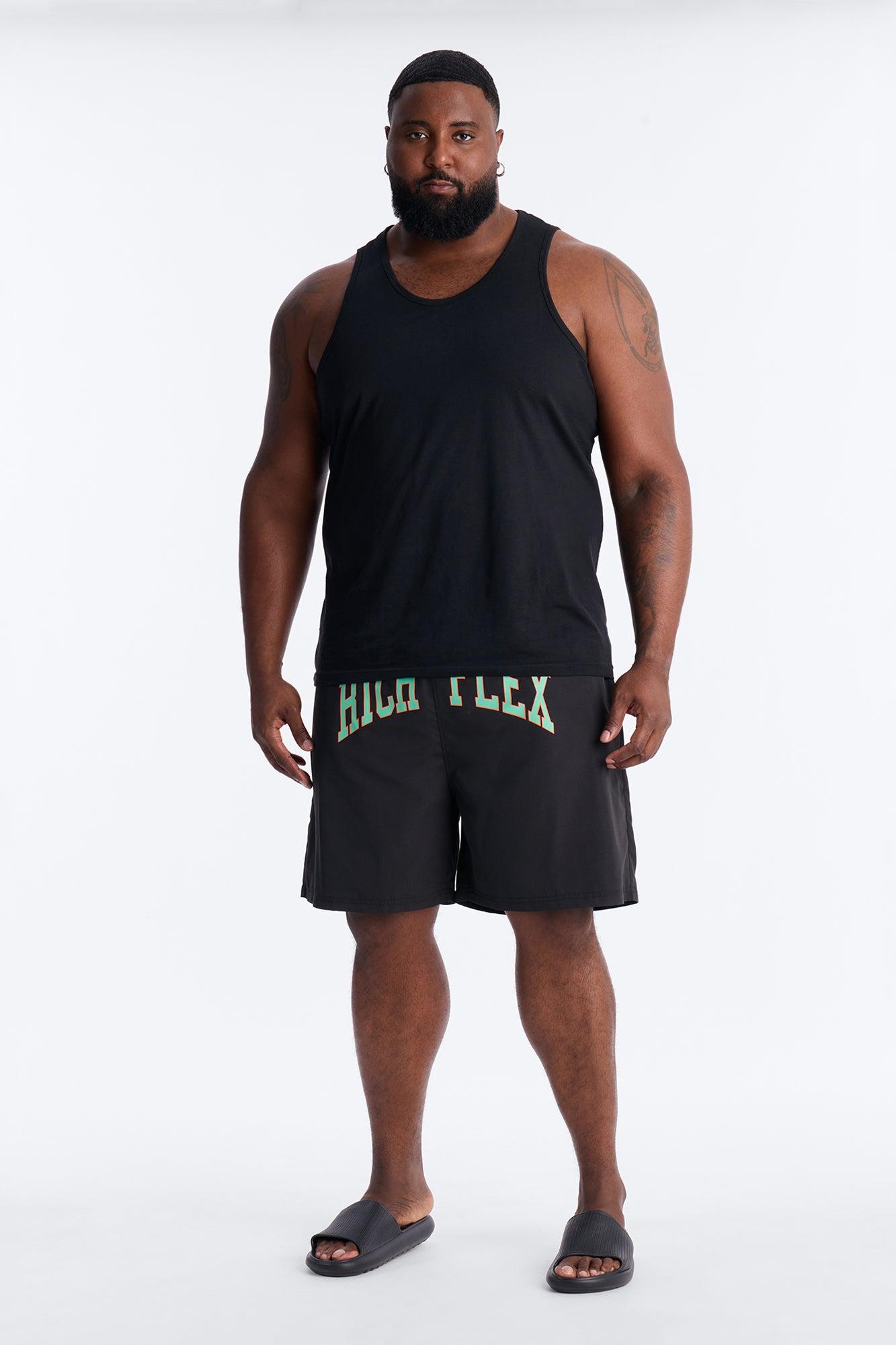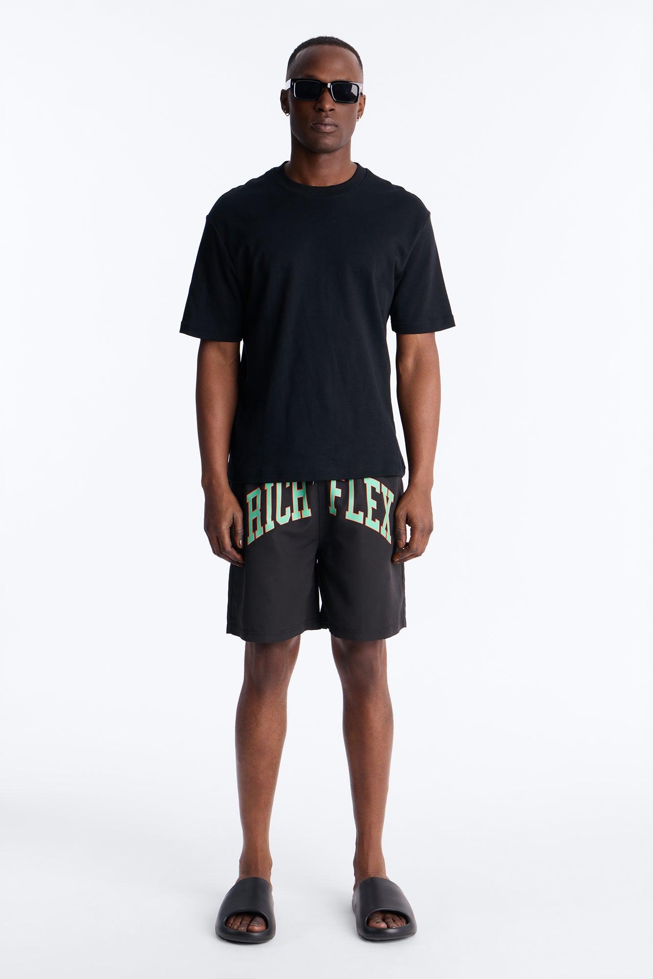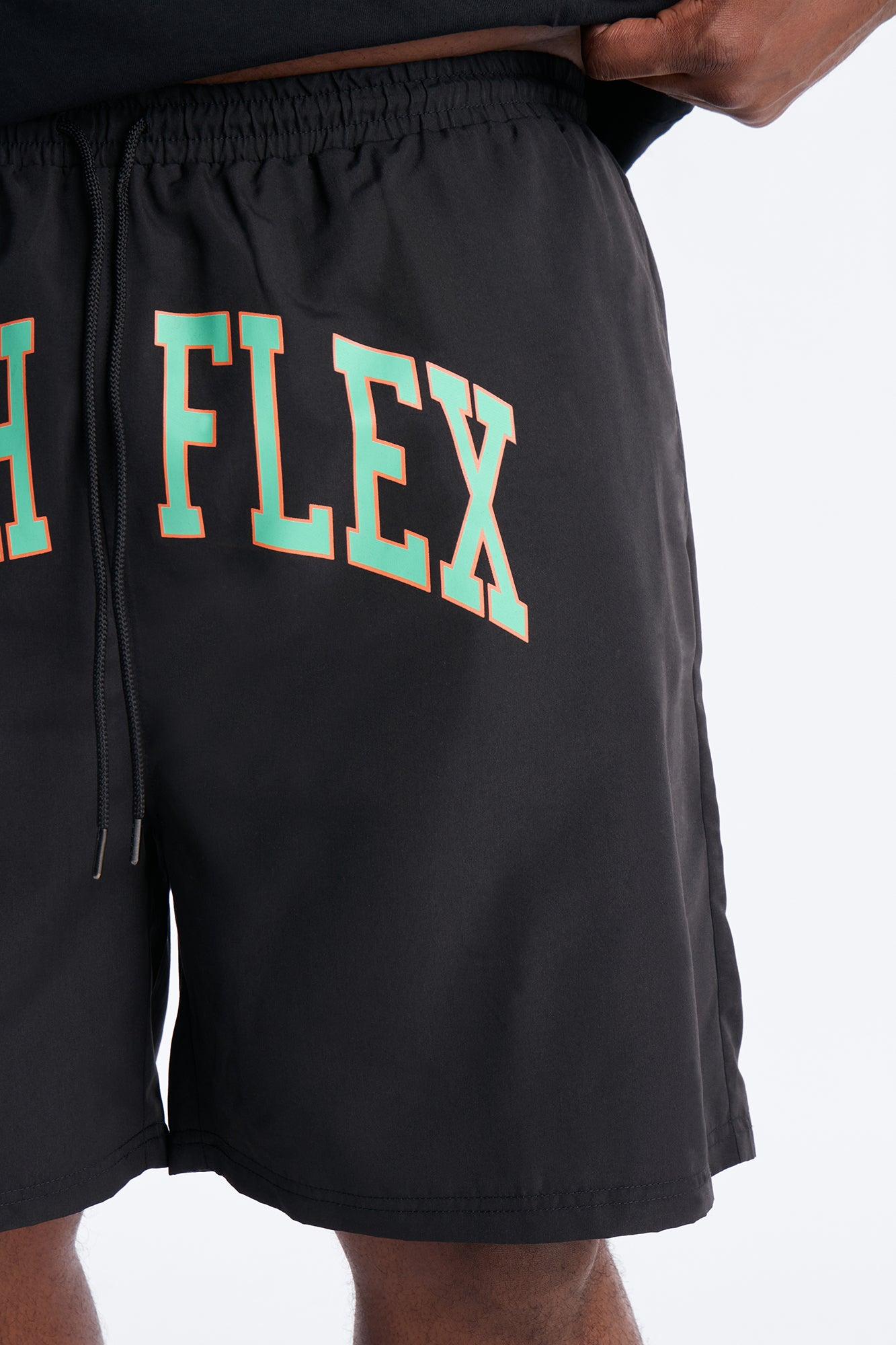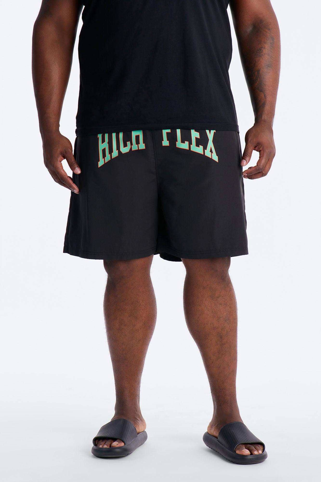 Available In Black/Green And Navy. 7" Inseam Elastic Waist Drawstring Full Basket Mesh Liner Side Hand Pockets Front "Rich Flex" Floral Graphic Detail Back Pocket Final Sale 100% Polyester Imported