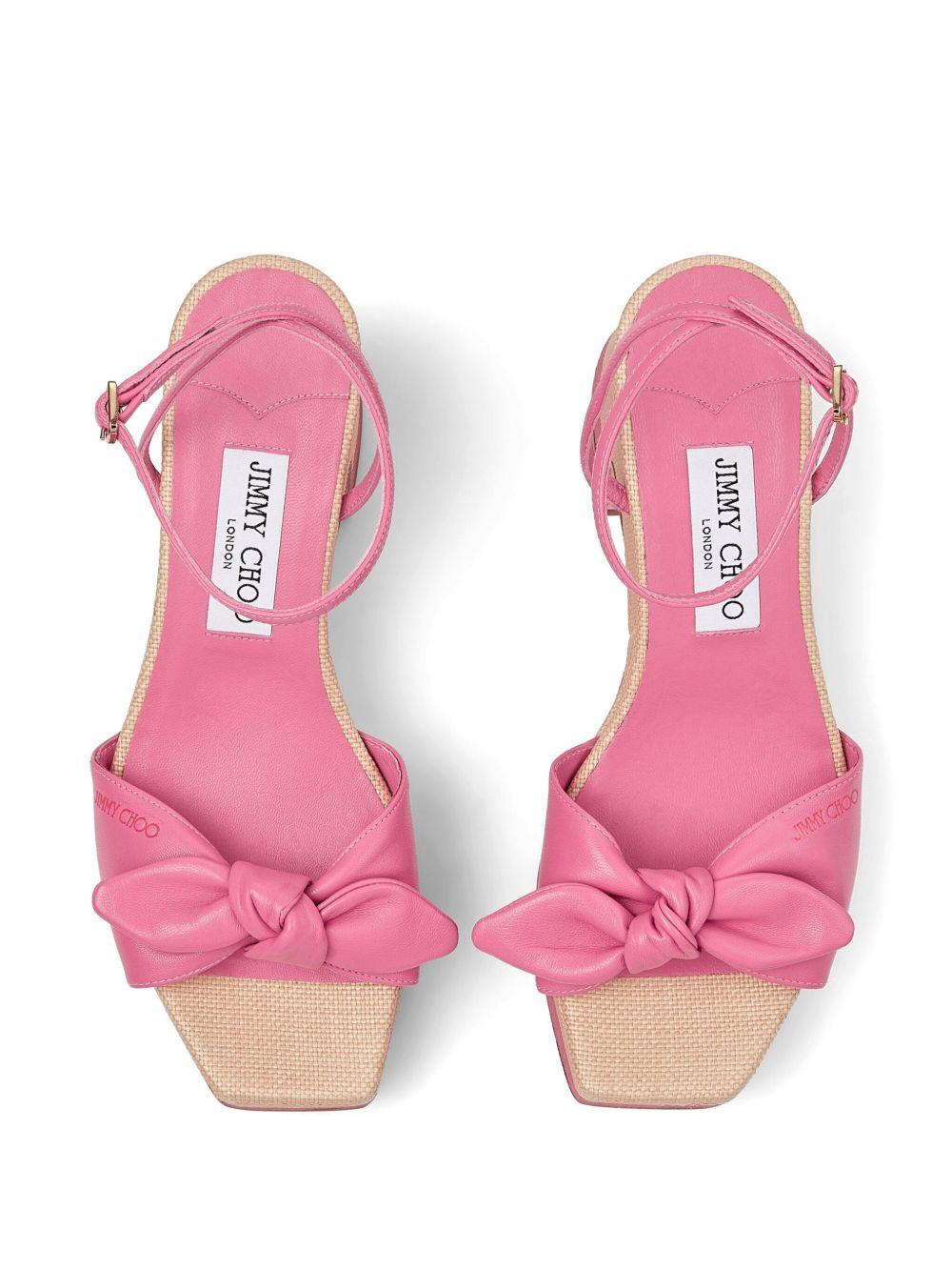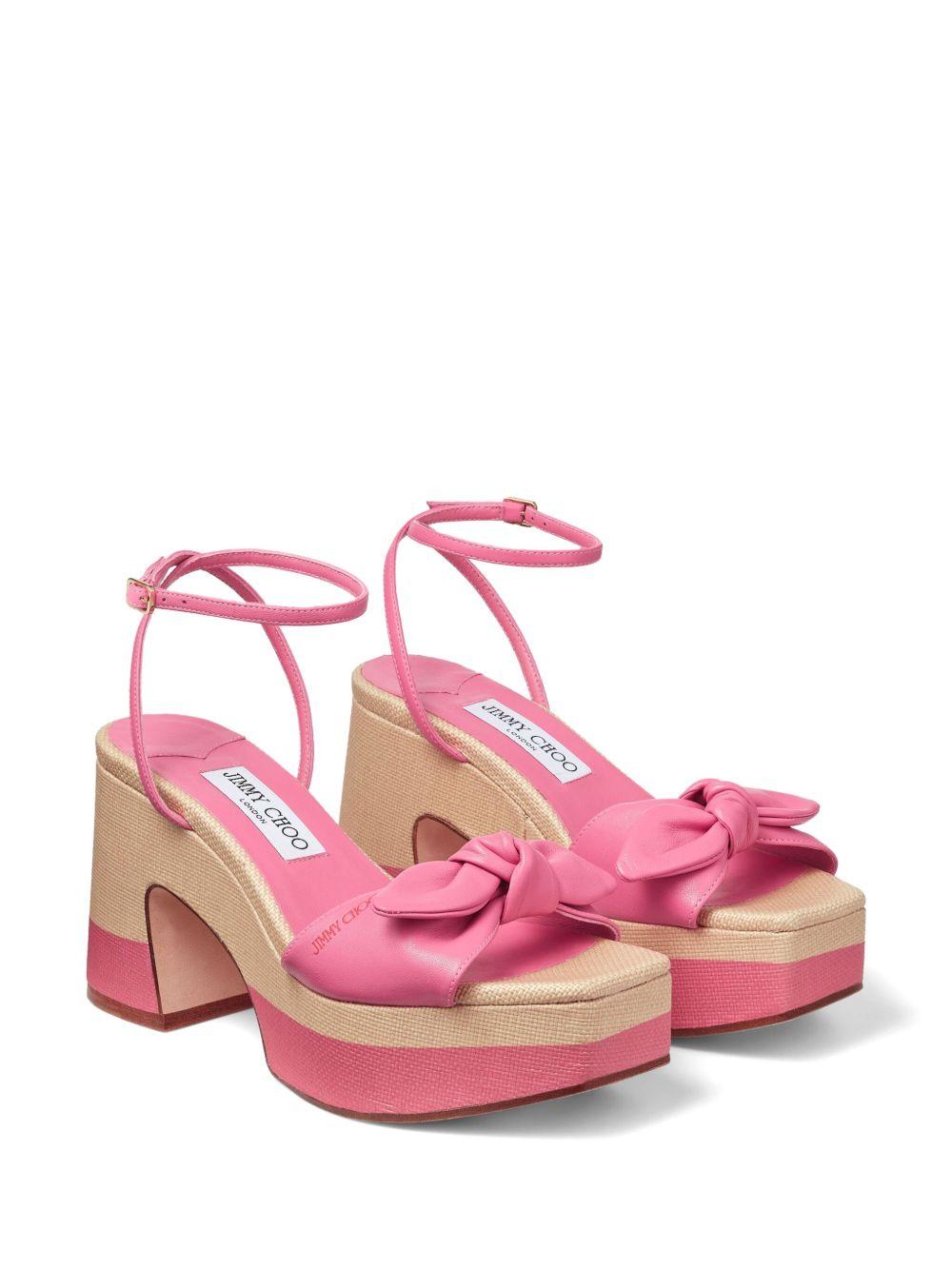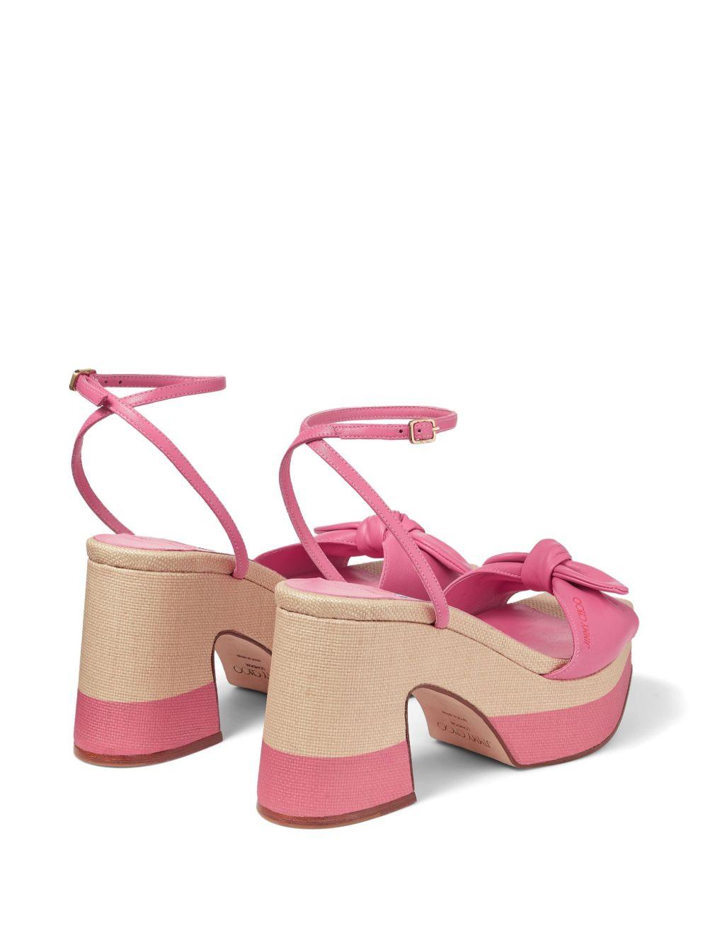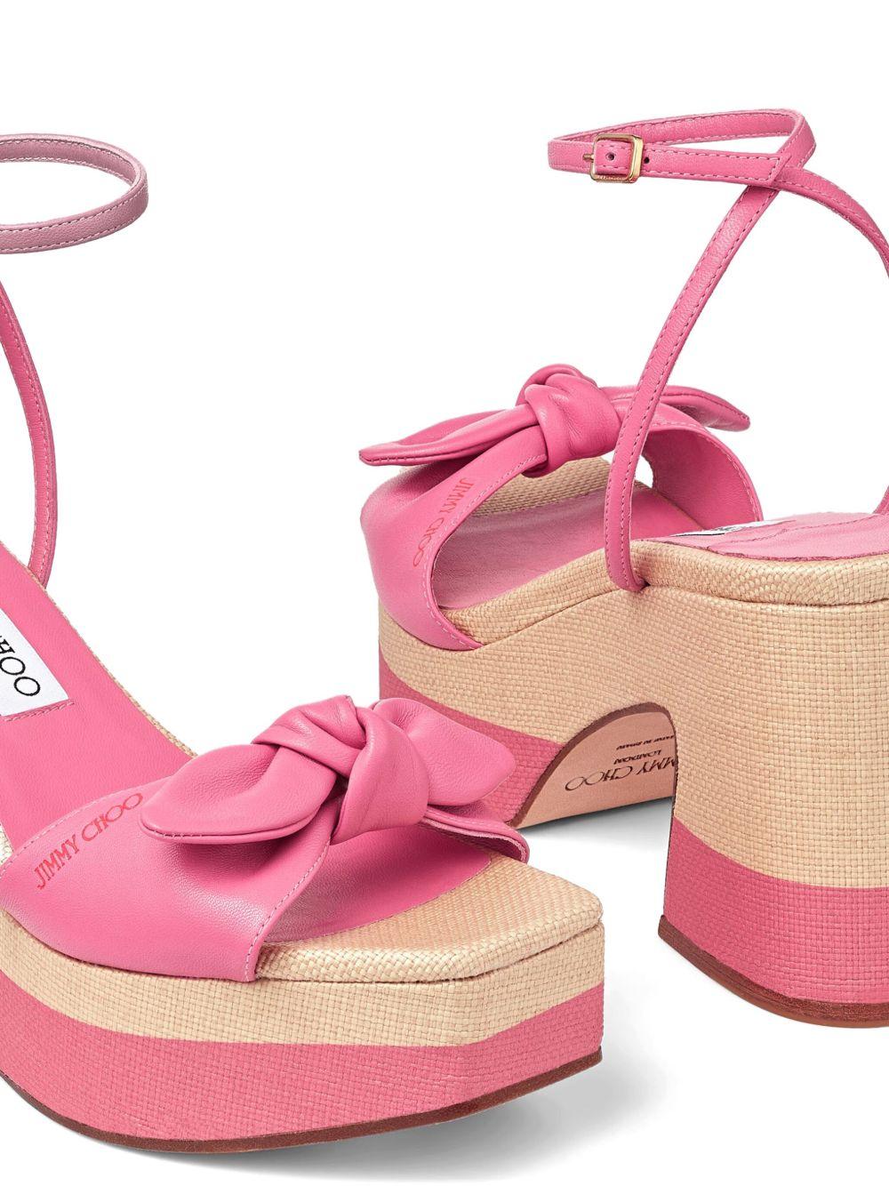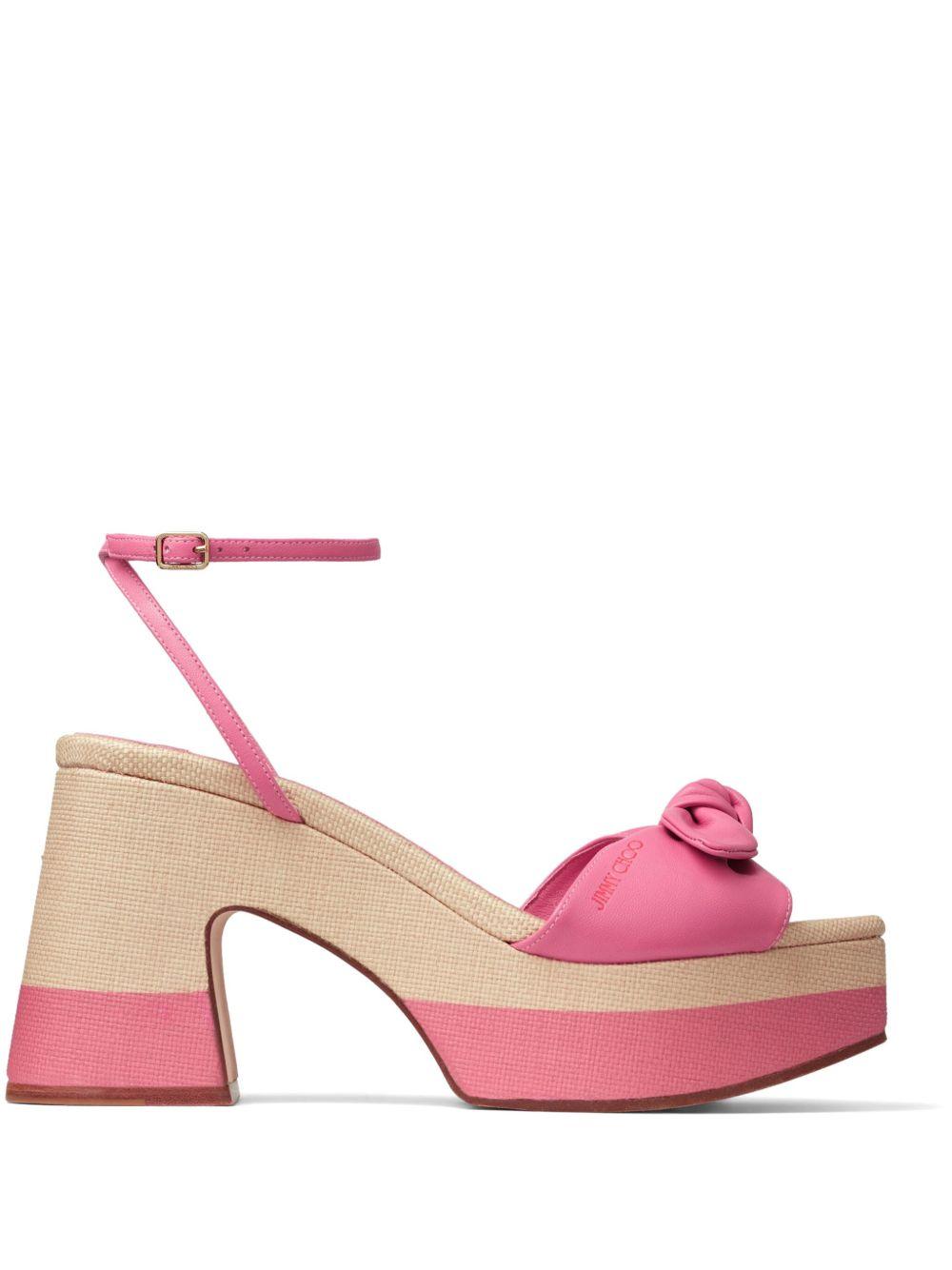 Jimmy Choo Ricia 95mm platform leather sandals | Pink | pink/beige | calf leather | knot detailing | square open toe | buckle-fastening ankle strap | platform sole | branded insole | high block heel | Leather | Heeled Sandals | Sandals | Shoes | Women
