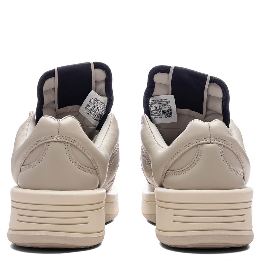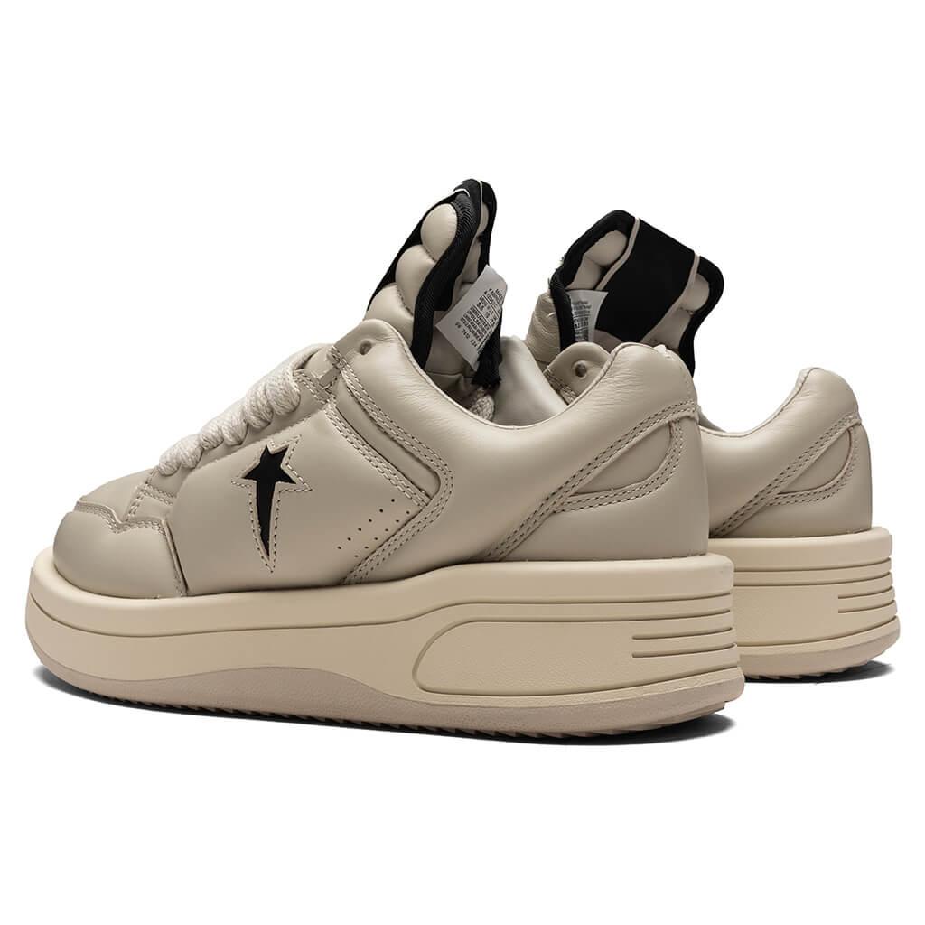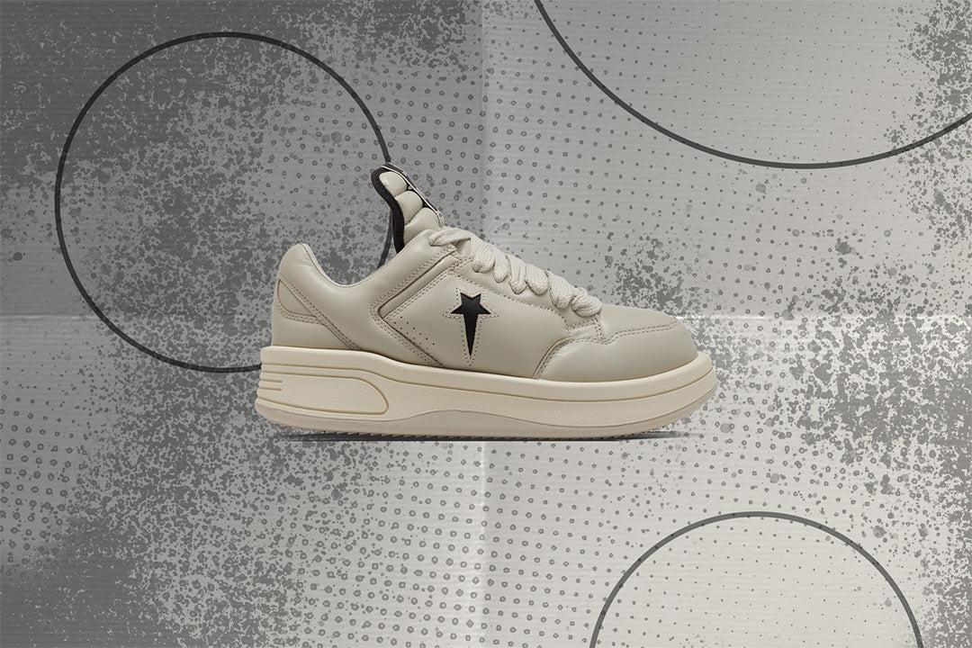 Rick Owens DRKSHDW and Converse reconnect to reconstruct a classic. Rooted in the iconic Converse Weapon—famously worn on the court by legends like Magic Johnson—the Turbowpn Ox strips it down and rebuilds it with brutalist precision and premium construction. This low-top edition arrives with a full oyster leather upper with black accents, paired with tone-on-tone oyster laces and a natural-colored rubber sole for stark contrast. True to DRKSHDW’s aesthetic code, the silhouette features an exaggerated foam-molded toe, oversized Weapon tooling, and the signature sawtooth outsole that pushes it further into the avant-garde. Air vent perforations at the toe and side offer breathability, while the Converse logo on the lateral quarter and collaborative branding on the sole complete the design. Cow leather upper Tonal lace closure Elongated tongue Exaggerated foam molded toe Perforated holes Woven label tag Chunky laces Co-branding All sizes are listed in U.S. Men's sizing unless stated otherwise Style No: DC01EX062-A12R0-6109