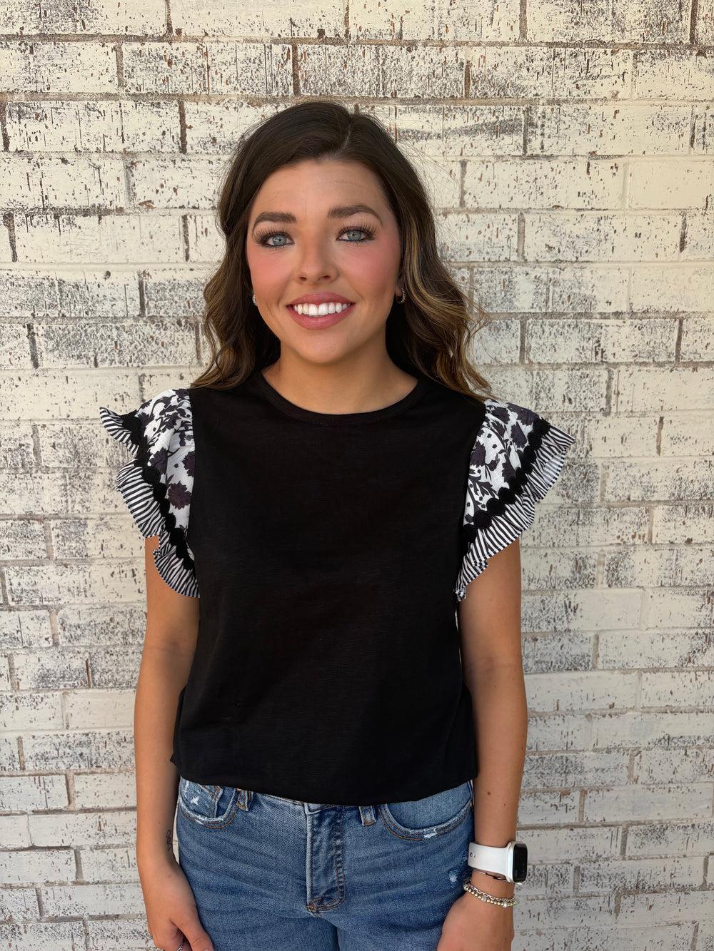 Ricrac Trim Printed Flutter Sleeve Contrast Blouse 2 Colors | Gussied Up Online BoutiqueBrighten your wardrobe with this playful Ricrac Trim Printed Flutter...