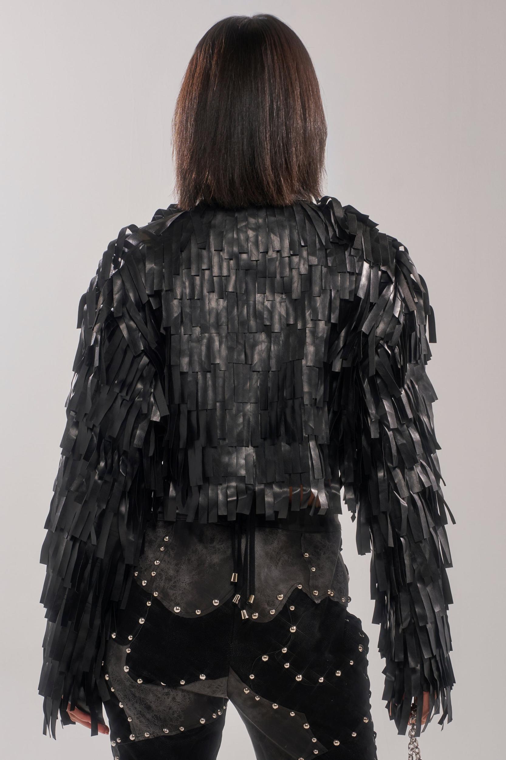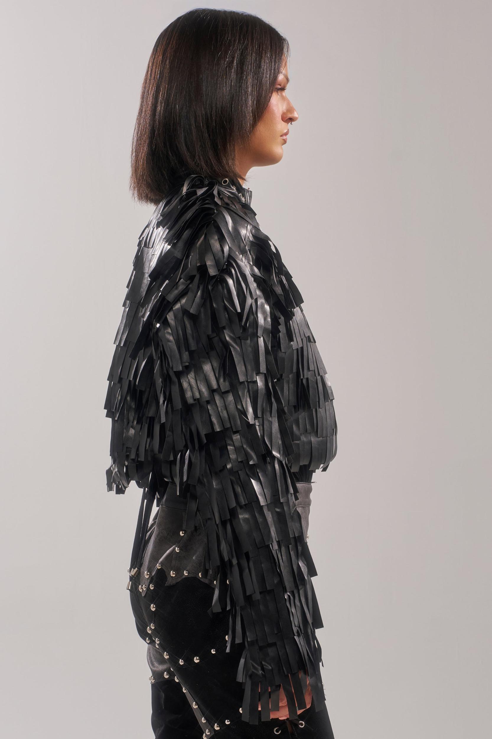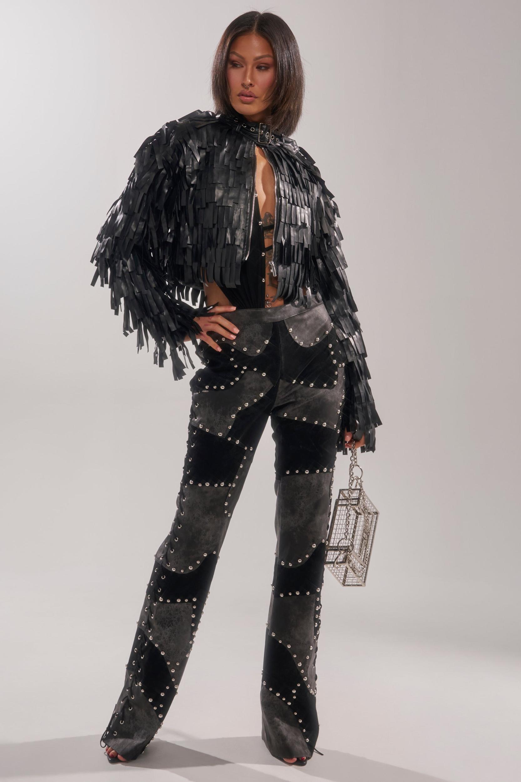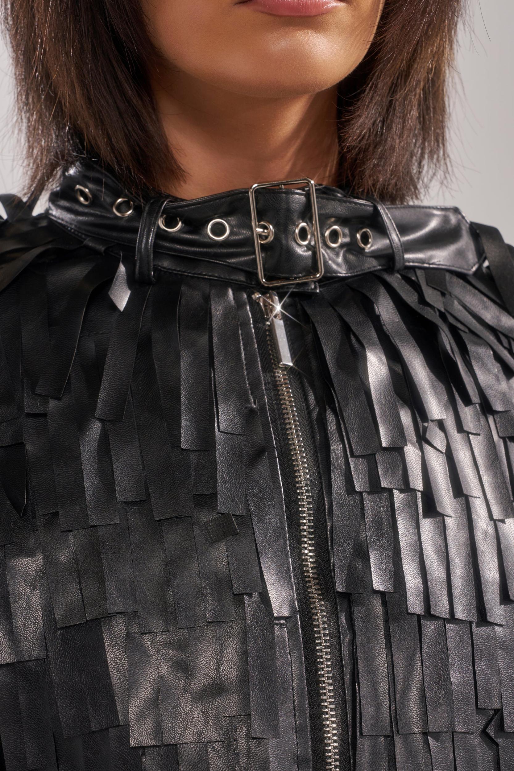 Giddy up, cowgirl! The AKIRA Label Ride ‘Em Fringe Moto is crafted from a supple faux leather and covered in all-over fringe detailing. It features a mock collar lined with an adjustable belt accent, long sleeves, a center-front zipper closure, and a sleek inner lining. Complete with a boxy, cropped silhouette. - Shell: 55% PU 45% Rayon- Little Stretch- Imported (all measurements approximate from size small) - 15” Shoulder to Hem, 17” Including fringe- 20” Shoulder to Shoulder- 21” Sleeves, 23” Including fringe- Model is 5’7” and is wearing size smallProduct ID: 1075983 (all measurements approximate from size 1X)- 17” Shoulder to Hem, 19” Including fringe- 22” Shoulder to Shoulder- 22” Sleeves, 24” Including fringeProduct ID: 1075987