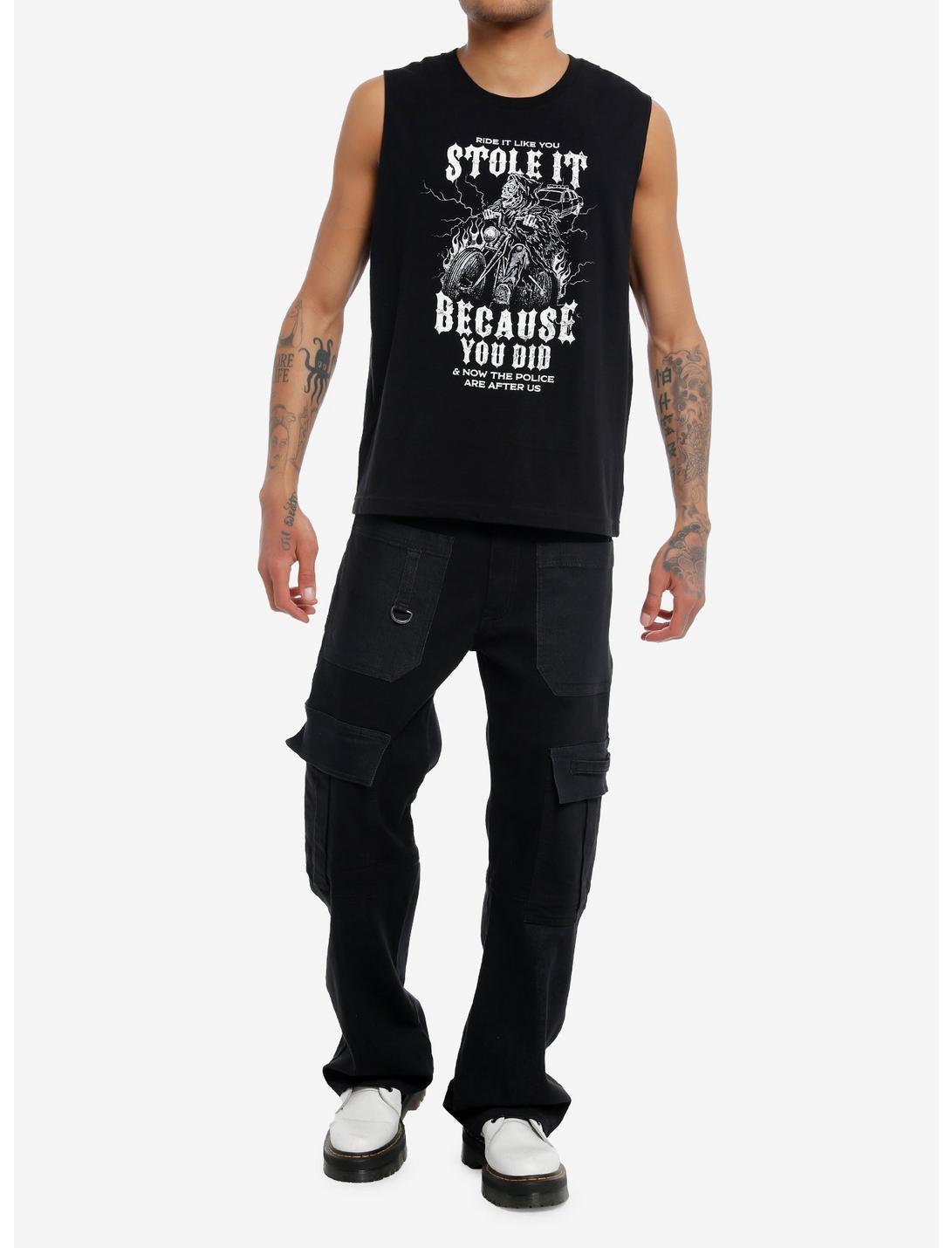 This funny muscle tank shows a grim reaper shredding on a motorcycle with a cop car in pursuit, with text reading "Ride it like you stole it, because you did & now the police are after us."100% cottonWash cold; dry lowImportedListed in men's/unisex sizesModel is 6'1"Model wears size Medium