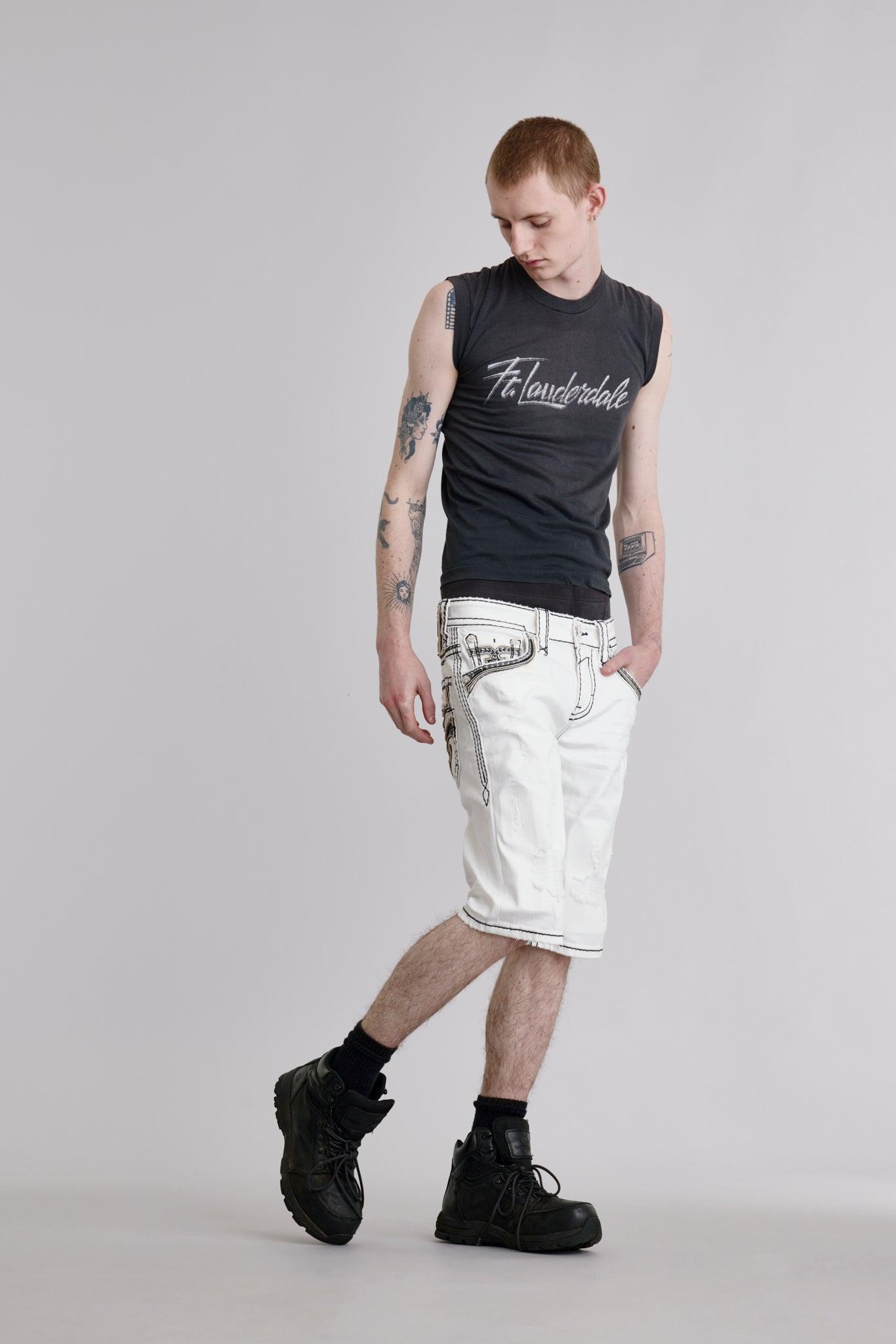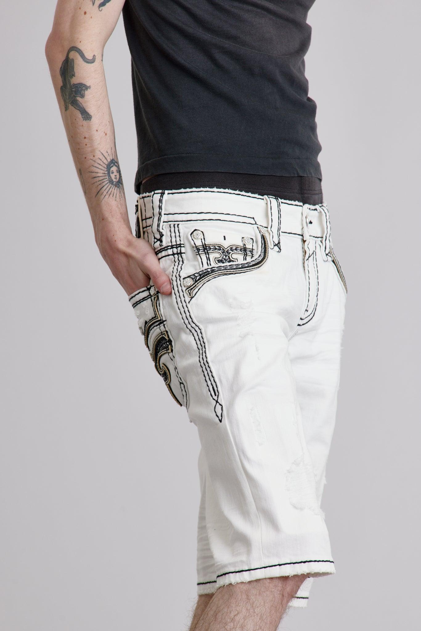 Rielly Denim Shorts by Rock Revival features a mid rise crafted in a white wash, designed in Los Angeles.