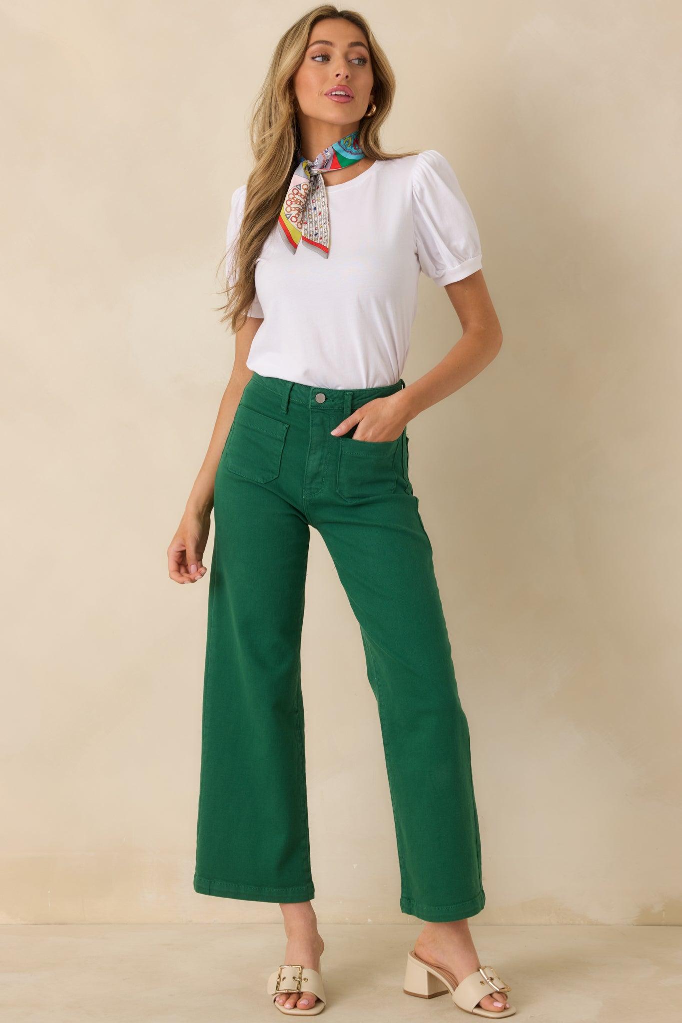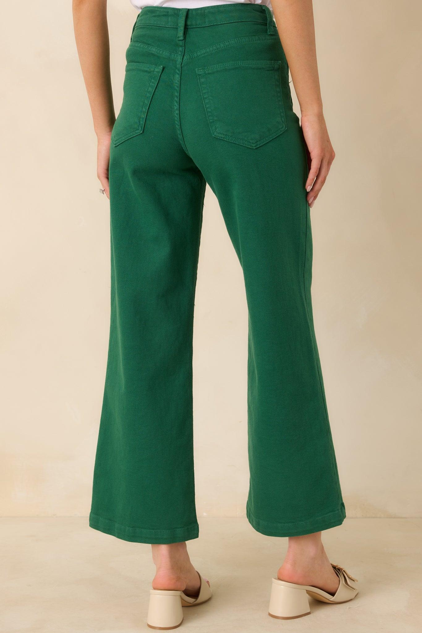 The Right Where We Are Kelly Green Cotton High Waisted Wide Leg Jeans set the tone for the day, a standout denim style that feels current and effortlessly put together. These green denim jeans feature a high-rise waist, belt loops, a zip fly with button closure, functional front and back patch pockets, and a wide leg silhouette.96% Cotton, 3% Elastrell, & 1% Spandex Unlined Machine Wash Cold Manufactured & Designed in The USA Model is 5'8" and is Wearing a Size 24