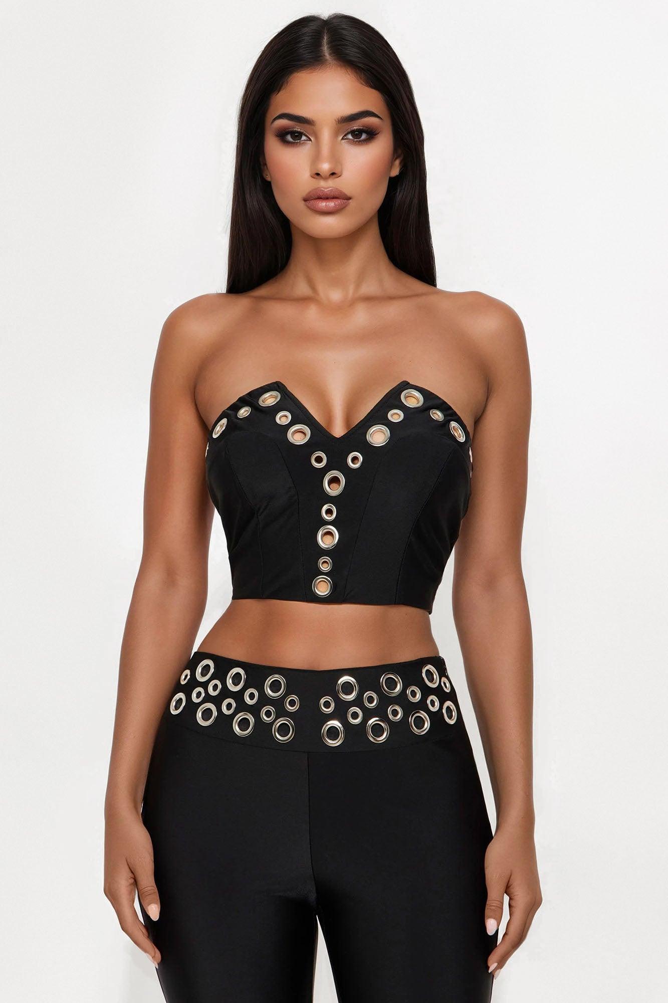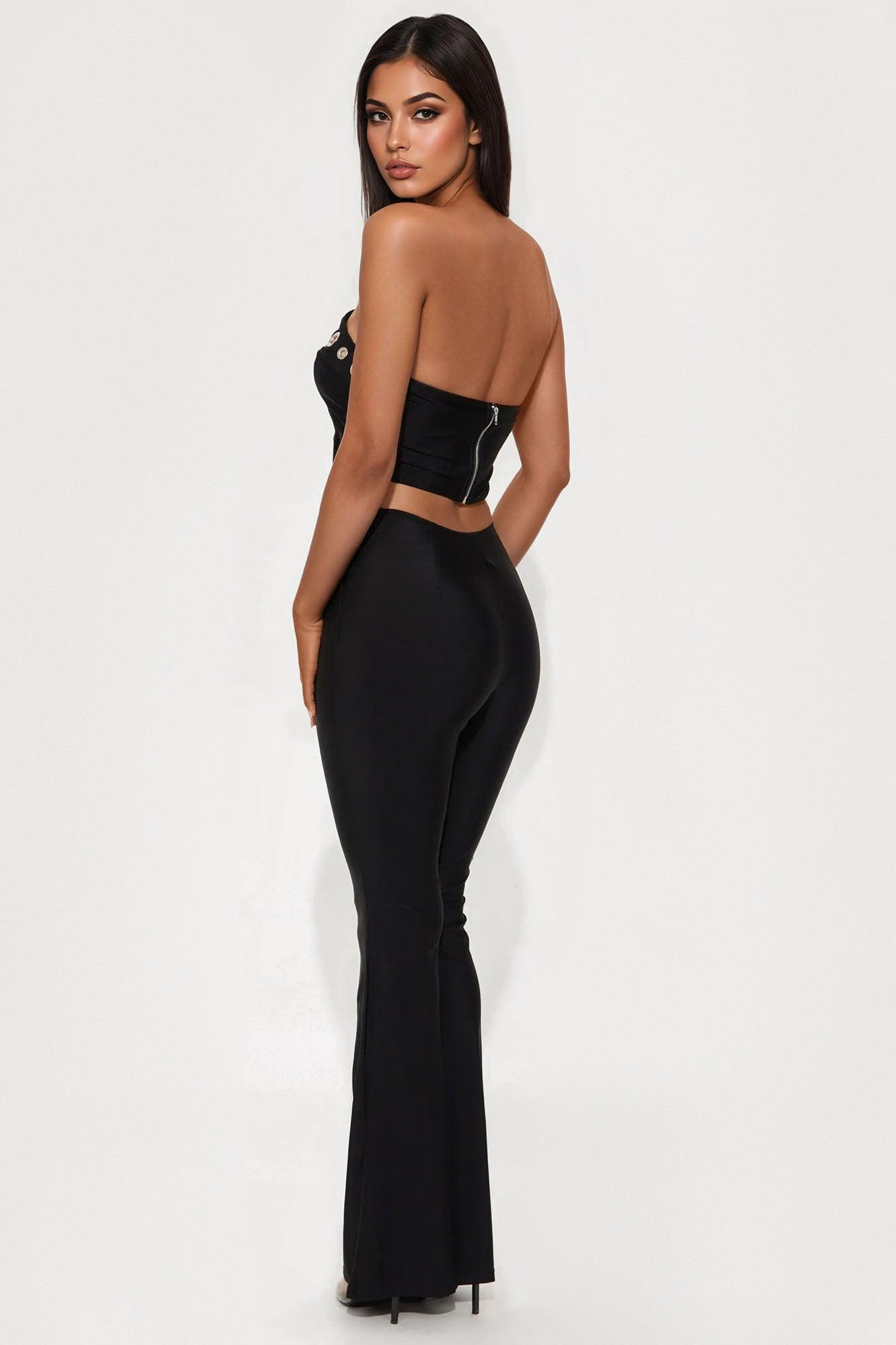 Available In Black. 2 Piece Ensemble Corset Top and Flare Pant Set Stretch Shell Top: 82% Nylon 18% Spandex Lining: 100% Polyester Shell Bottom: 82% Nylon 18% Spandex Imported