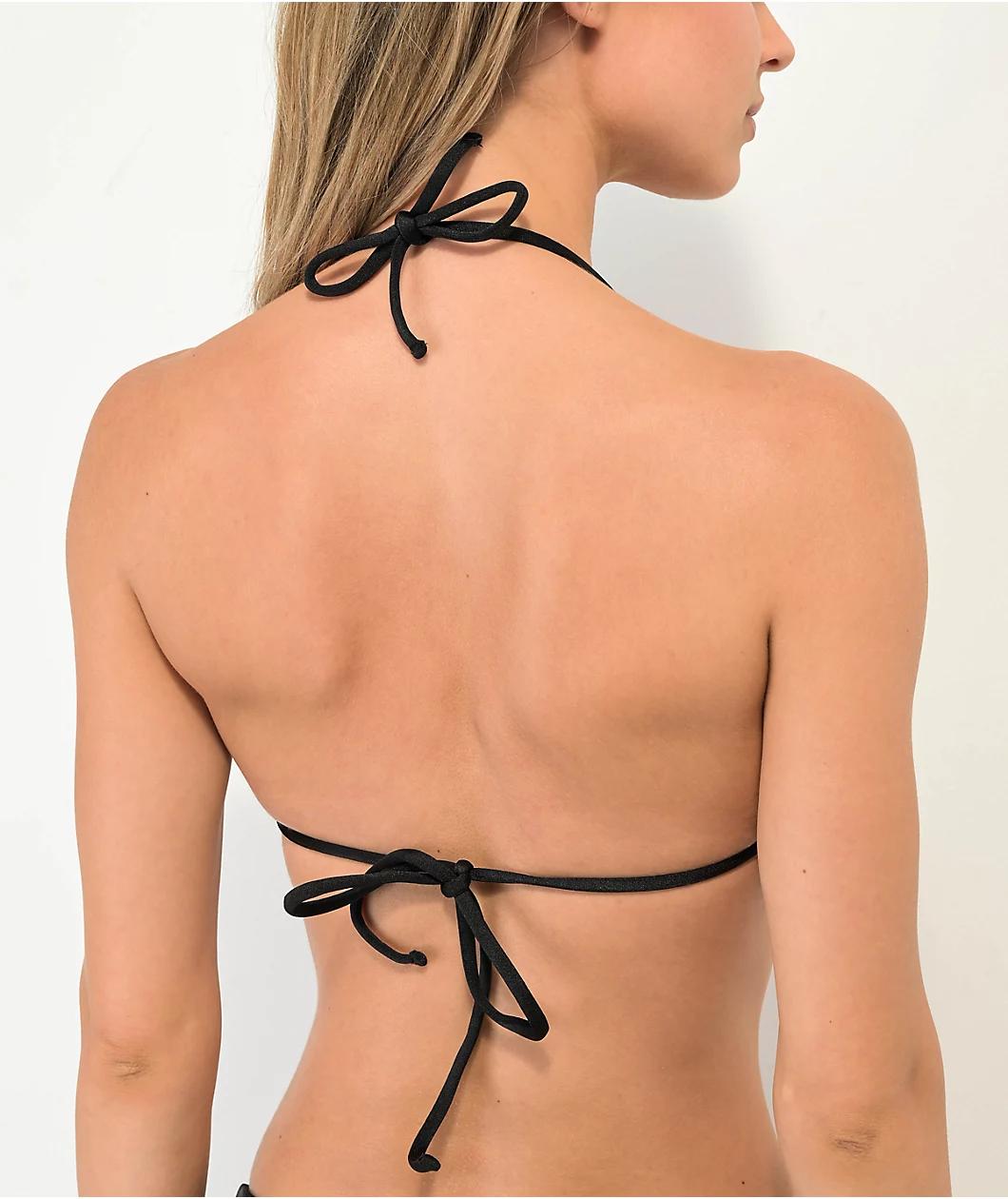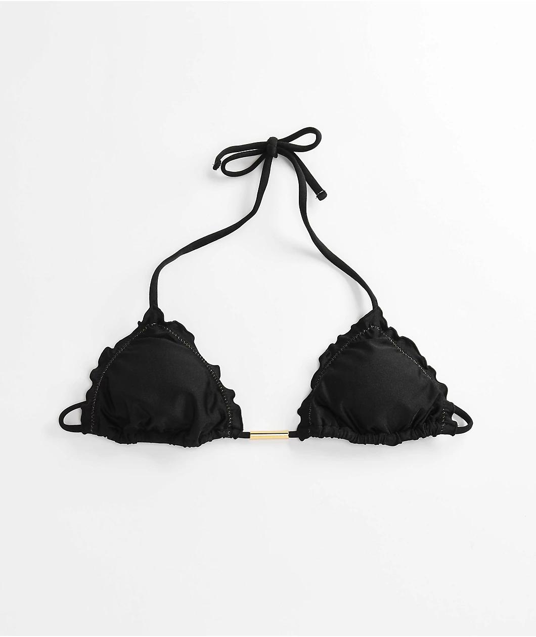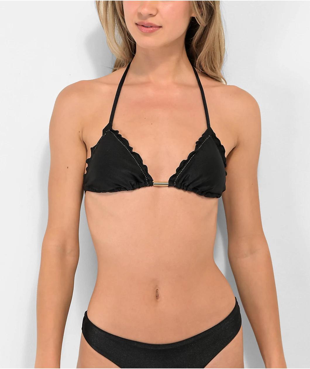 The Frufru Shimmer bikini top from Rio De Sol comes in a sleek black colorway, offering a classic summer look with a triangle bikini top with adjustable spaghetti straps. This swim top comes with removable pads for a versatile look and feel, complete with
