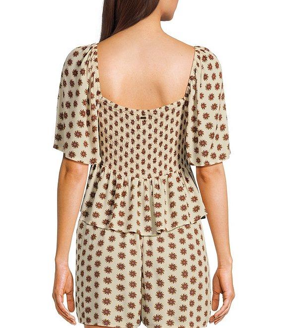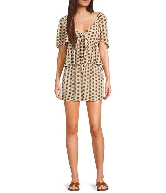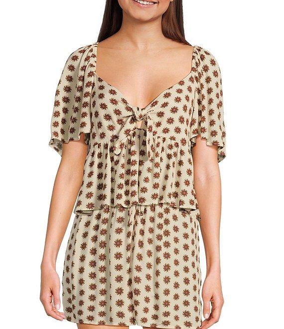 From Rip Curl, this top features: Allover yardage print V-neckline with knotted tie detail Short sleeves Ruffled, flounced hem Metal logo trim Inner neck label Pullover styling Standard fit Silicone wash Lenzing™ EcoVero™ crinkle viscose Machine wash/line dry Imported.