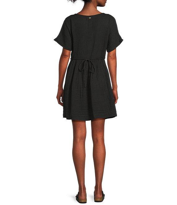 From Rip Curl, this dress features: V-neckline Short sleeves Button-front closure Full, pleated skirt Fit and flare silhouette Inner neck label Metal logo trim Standard fit Garment washed double-weave cotton Machine wash/tumble dry Imported.
