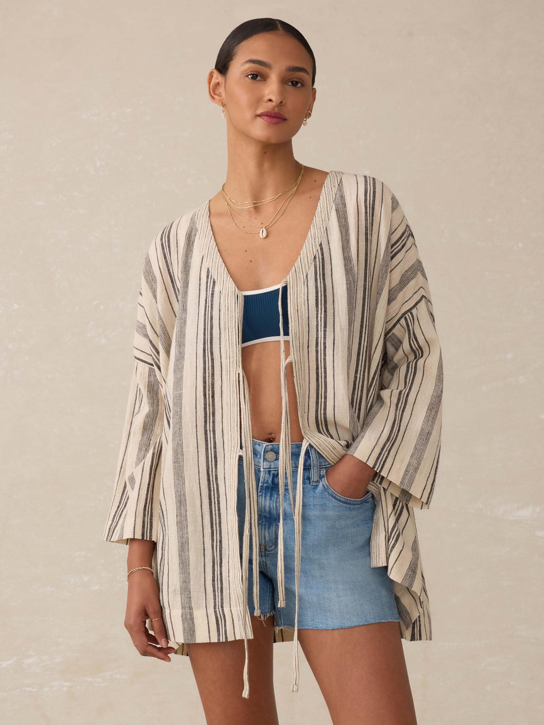 Easy does it. This open-front cover-up is made from soft, breathable cotton and designed with adjustable self ties for a custom fit. Light and airy with a laid-back drape, it’s the perfect throw-on layer for beach days and poolside lounging. Fit: Relaxed Body, Length 31 1/2" Detail: Open front with self ties. Material: 100% Organic Cotton Model: Angelica is 5'10 wearing size XS/S Care: Close all fastening before wash. Turn inside out. Machine wash cold with like colors. Delicate cycle. Do not bleach. Tumble dry low. Remove promptly. Cool iron when needed. WTU2530-SYT *Pricing shown reflects current online price and may not match ticket's MSRP