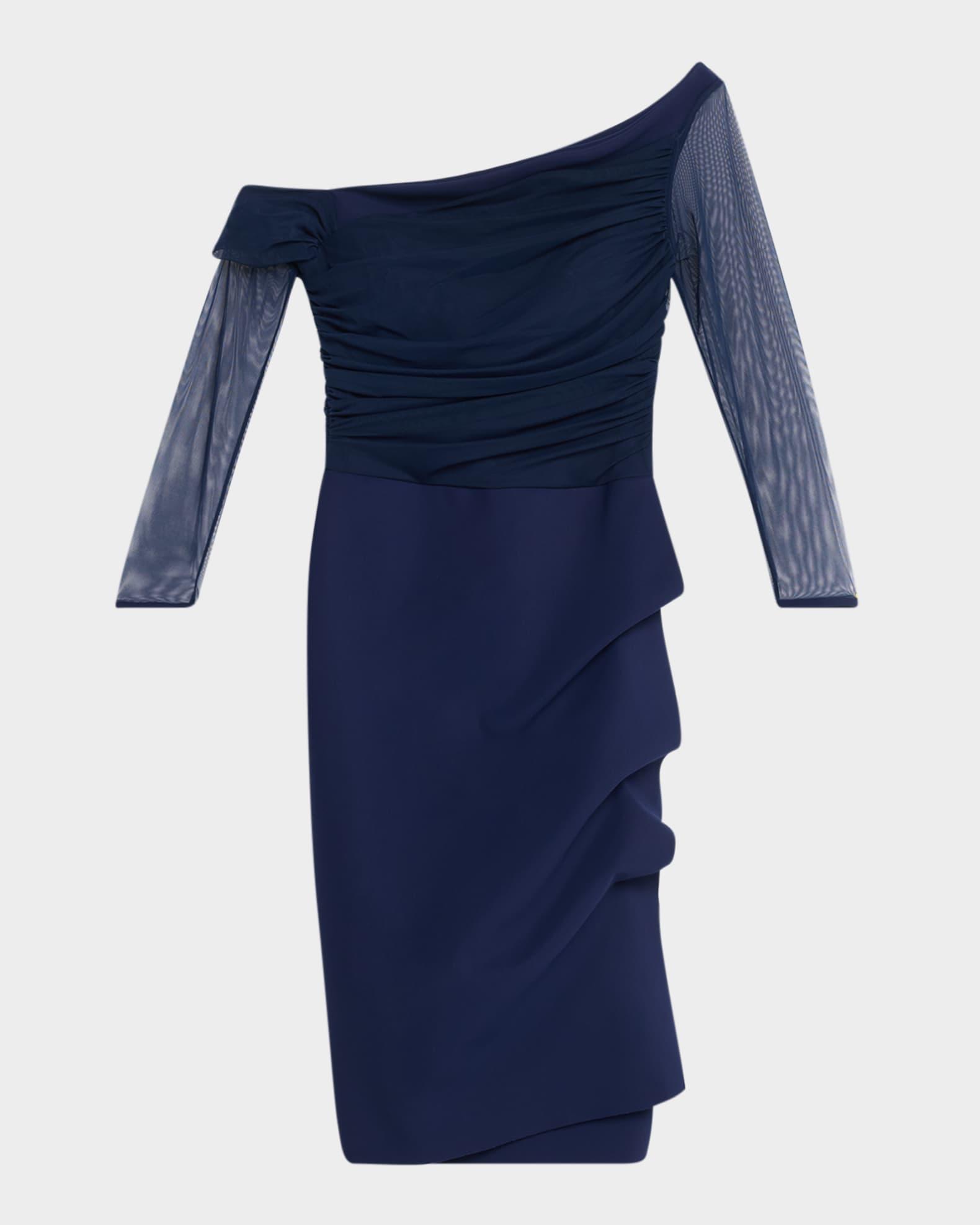 Chiara Boni La Petite Robe "Riplania" ruched dress with sheer sleeves Approx. 40"L from shoulders to hem One-shoulder neckline 3/4 sleeves Hem hits around the knee Bodycon silhouette Nylon/polyamide/elastane Made in Italy Please note: To dress, step into garment rather than pulling it over the head.