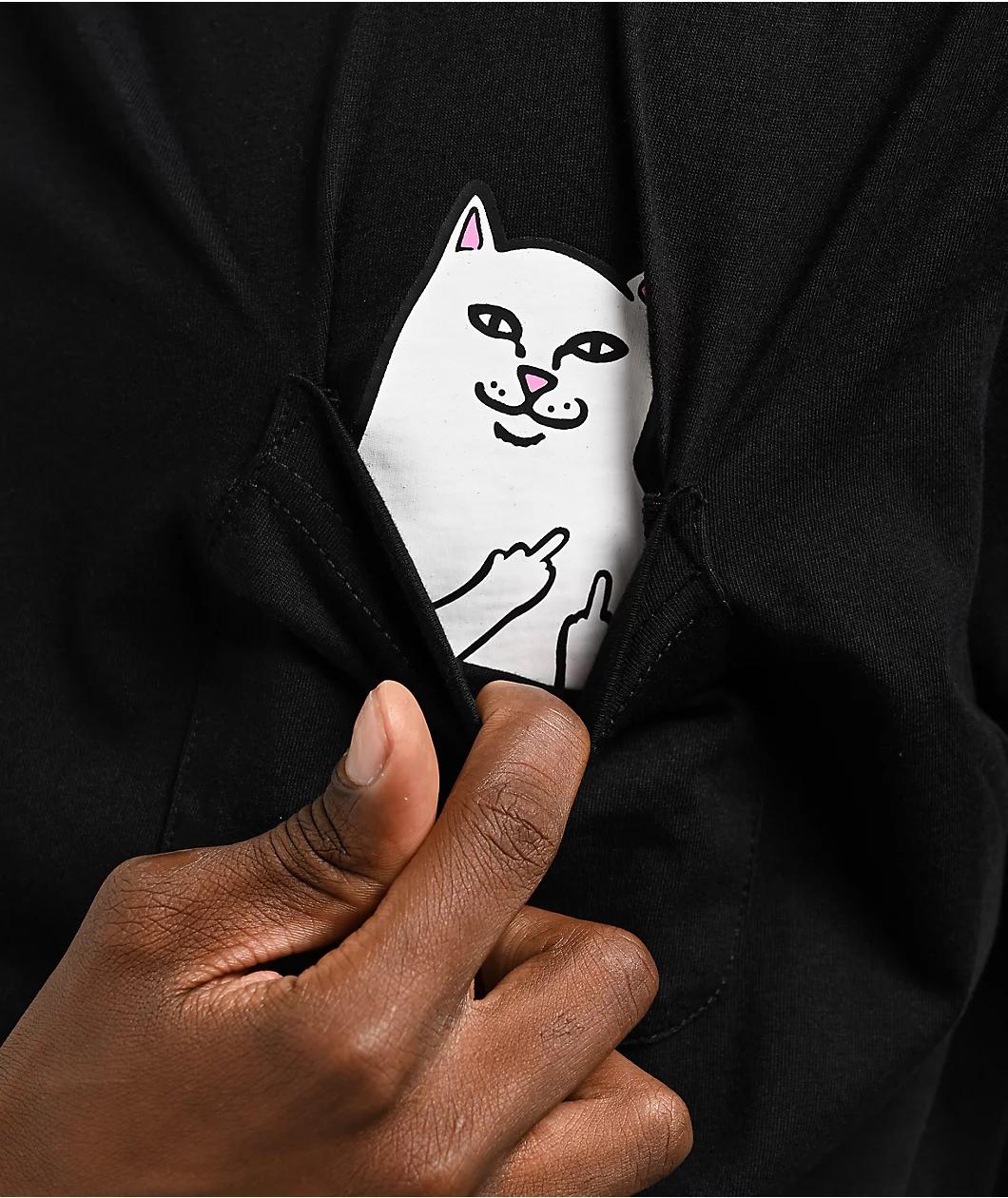 Enjoy a casual look with the black Lord Nermal pocket t-shirt from RIPNDIP. The classic tee features a screen-printed graphic of the brand's white cat mascot peeking out of a patch pocket. Looking inside the pocket reveals that the cat is flipping of