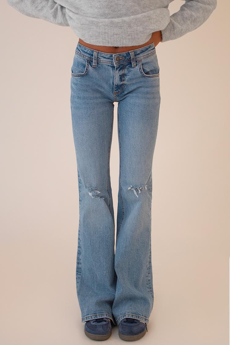 Flared jeans, ripped details, low waist, belt loops, button up and zip fastening, regular length, slim fit.