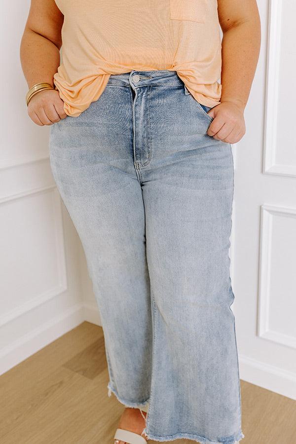 - Stay true to your unique style with these trendy jeans! - Stretchy denim material with subtle fading - A high waistline with belt loops, a hidden zip fly and button closure - Functional front and back pockets - A flare legged silhouette that ends in cropped, frayed hemlines