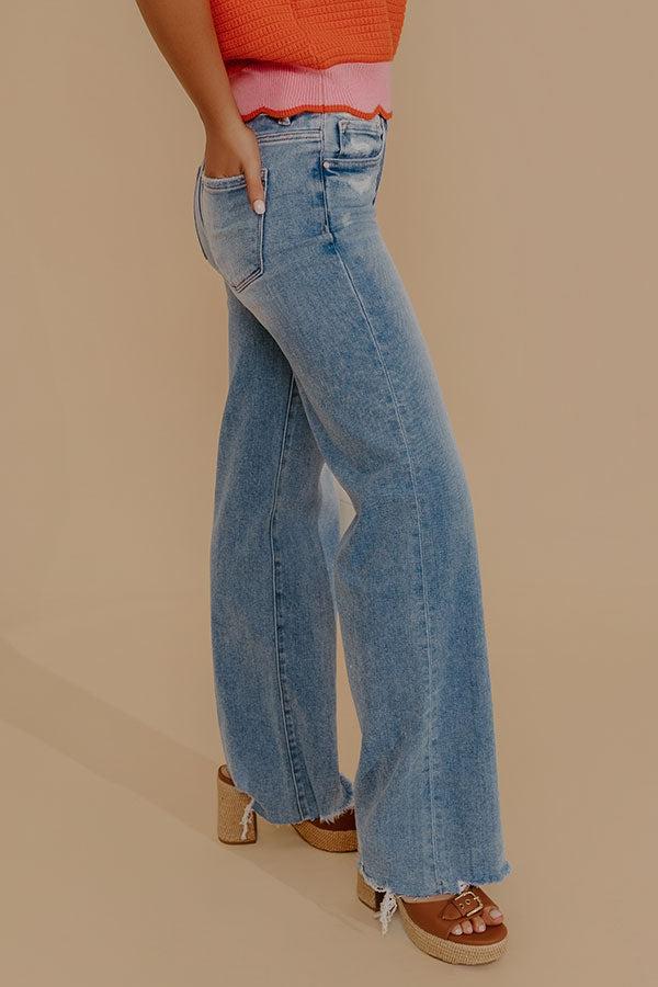 - Keep it cool in these distressed jeans. The wide leg silhouette and flattering fit make every outfit feel relaxed yet put-together. - Unlined stretchy denim material with a fading and distressed detailing - A midrise waistline with belt loops ad a tummy control feature - A hidden zip fly and button closure - Functional front and back pockets - A wide leg silhouette that ends in an unfinished frayed hemline