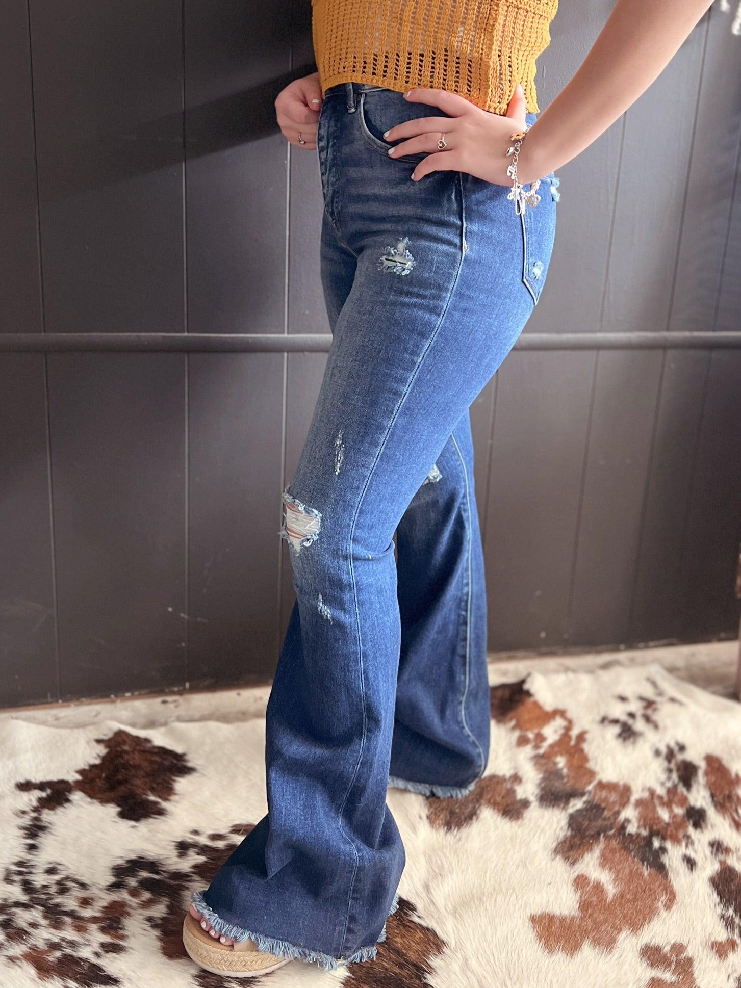 Risen Lightly Distressed Bootcut Jeans | Gussied Up Online Boutique Transform your wardrobe with our Risen Lightly Distressed Bootcut Jeans. Designed with a high rise and tummy control for a flattering fit, these jeans also feature light distressing and knee rips for a trendy, edgy look. The frayed bottom hem and bootcut style add a touch of comfort, while the stretchy fabric ensures all-day wearability. Upgrade your denim game today!