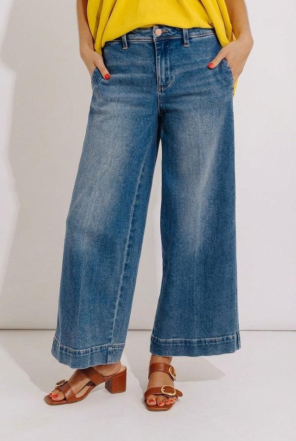 - Make every day cute with these darling jeans. Easy, chic, and ready for anything. - Unlined denim material with subtle fading - Belt loops - A hidden zip fly and button closure - Functional side pockets - Faux pocket cut accents at the back - A wide leg silhouette that ends in straight hemlines