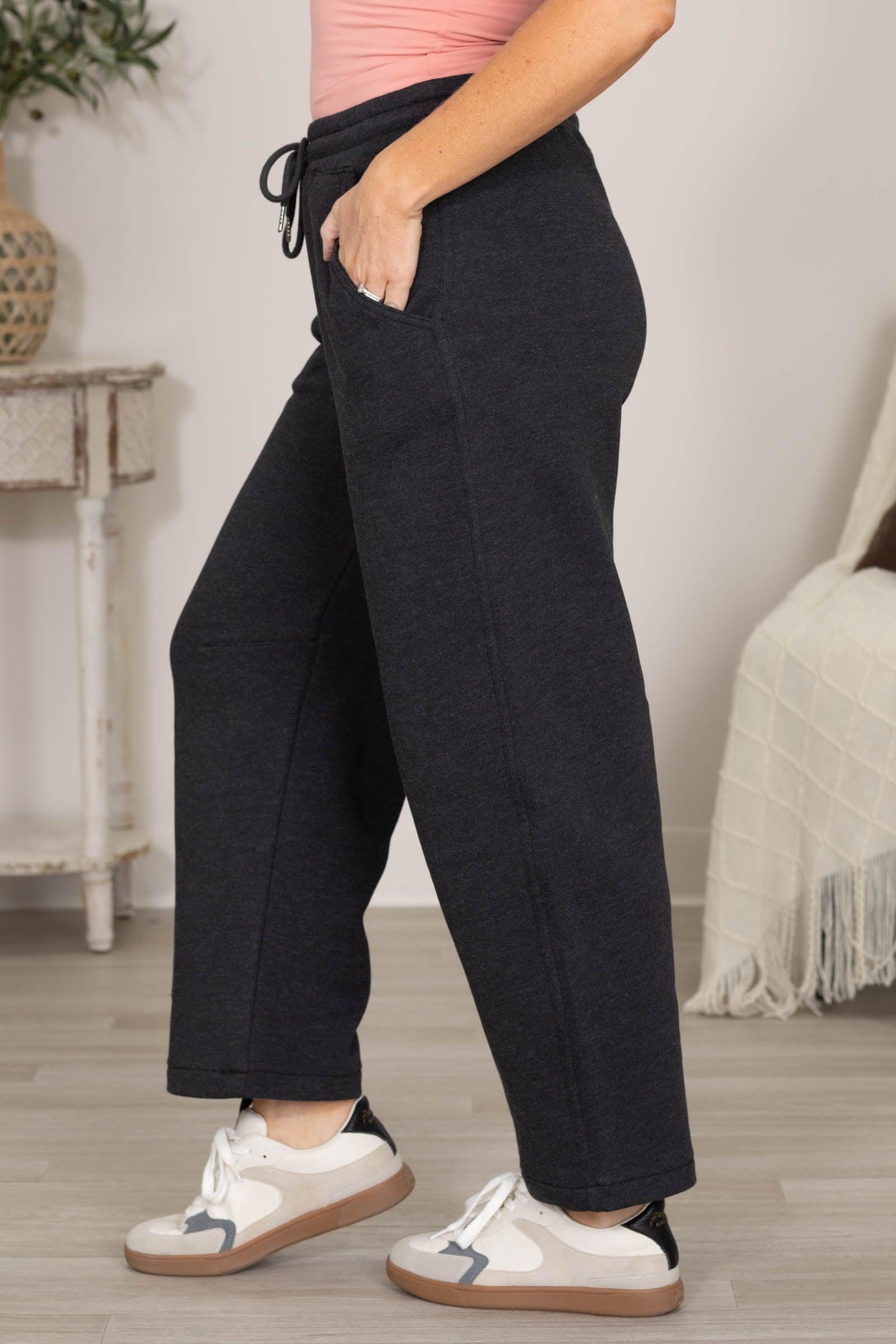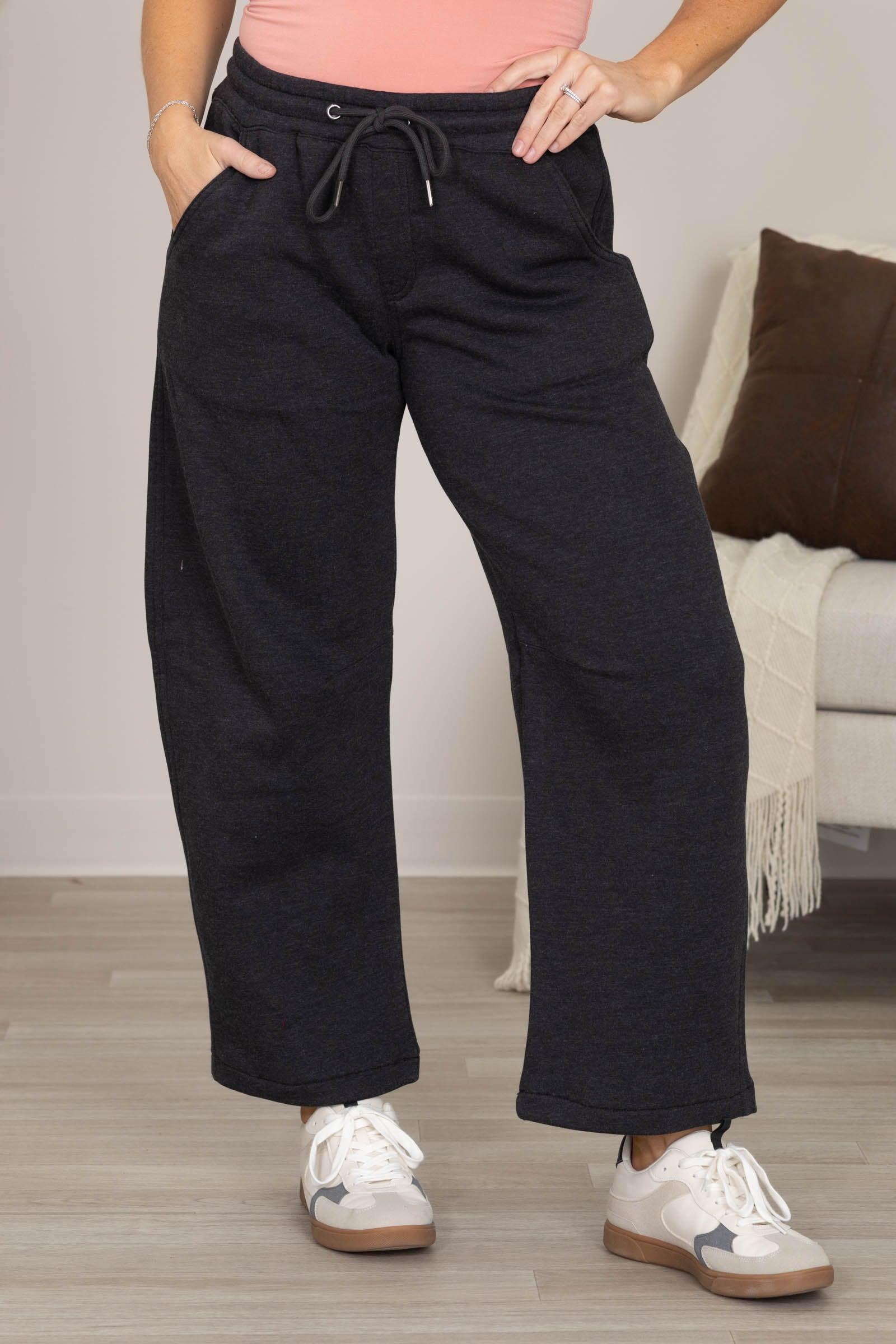 Product Details Colors: Heathered Black Print: Heathered Style: Barrel Sweatpants Brand: Risen Material and Care 40% Polyester 60% Cotton Machine Wash Cold Tumble Dry Low Size and Fit Small: Waist 28" Rise 11" Inseam 27" Medium: Waist 30" Rise 11" Inseam 27" Large: Waist 32" Rise 11.5" Inseam 27" X Large: Waist 34" Rise 12" Inseam 27" Erica is 5'7 and wearing her true size medium