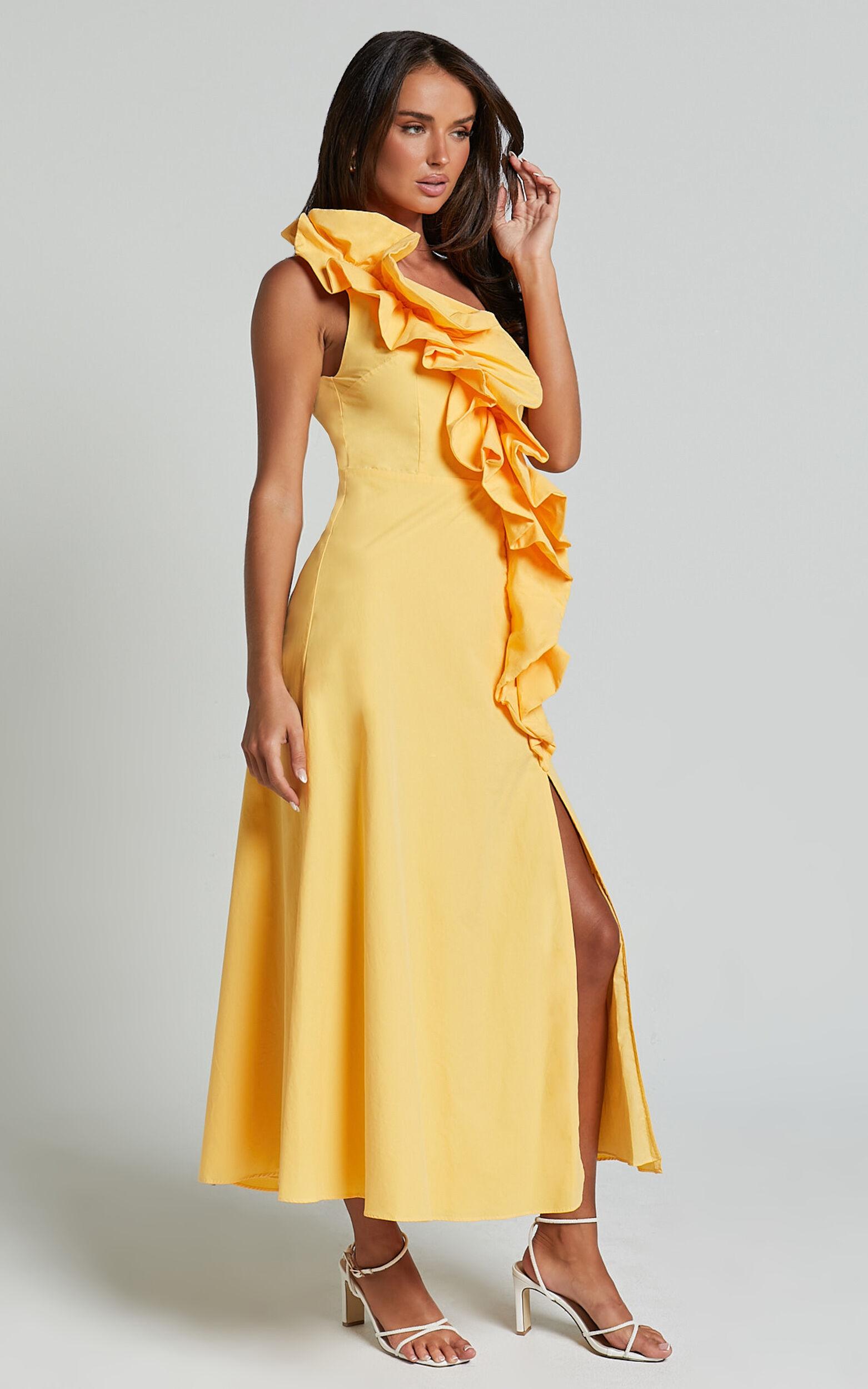 Make a statement in the Rita Midi Dress. This one-shoulder, ruffle detail dress is perfect for party days or any special occasion. The vibrant yellow color will have you standing out from the crowd, while the A-line silhouette flatters every shape and size. Made from poplin cotton, this midi dress is not only stylish but also comfortable to wear all day long. With its sleeveless design, it's easy to layer with your favorite jacket or cardigan for those cooler evenings. Embrace your inner fashionista and shine bright in the Rita Midi Dress - because you deserve to be noticed!Product Details:A Line DressPoplin FabricOne ShoulderParty Day WearMidi LengthSleevelessCotton MaterialSize and FitSize S / 8 length: 134cm / 52.76inMaterial and Care100% PolyesterLow / No stretch