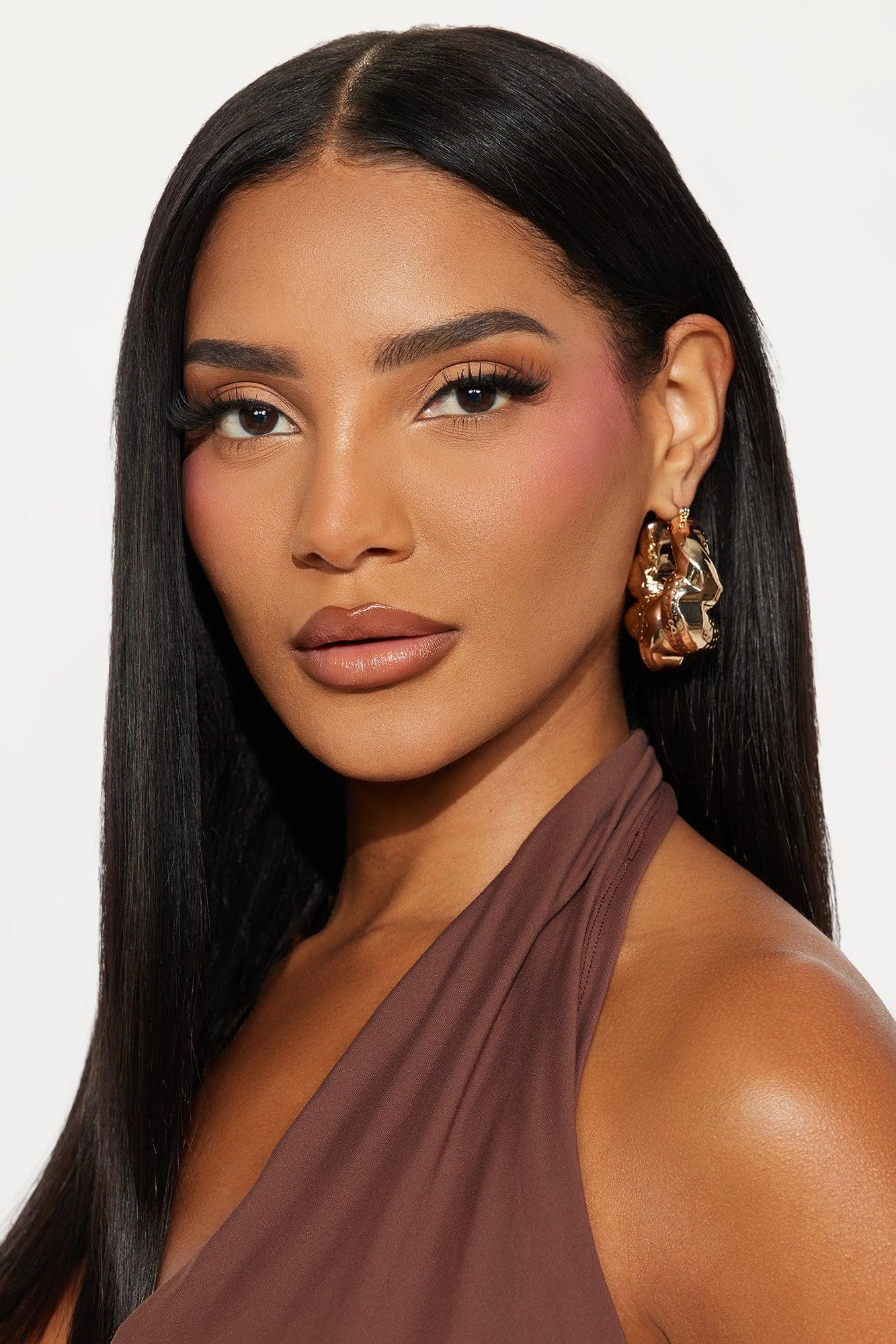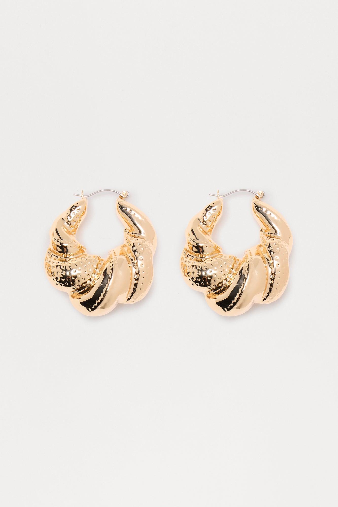 Available In Gold. Hoop Earrings Textured Latch Back Closure Metal Final Sale Imported California Proposition 65WARNING: Cancer and Reproductive Harm - www.P65Warnings.ca.gov.