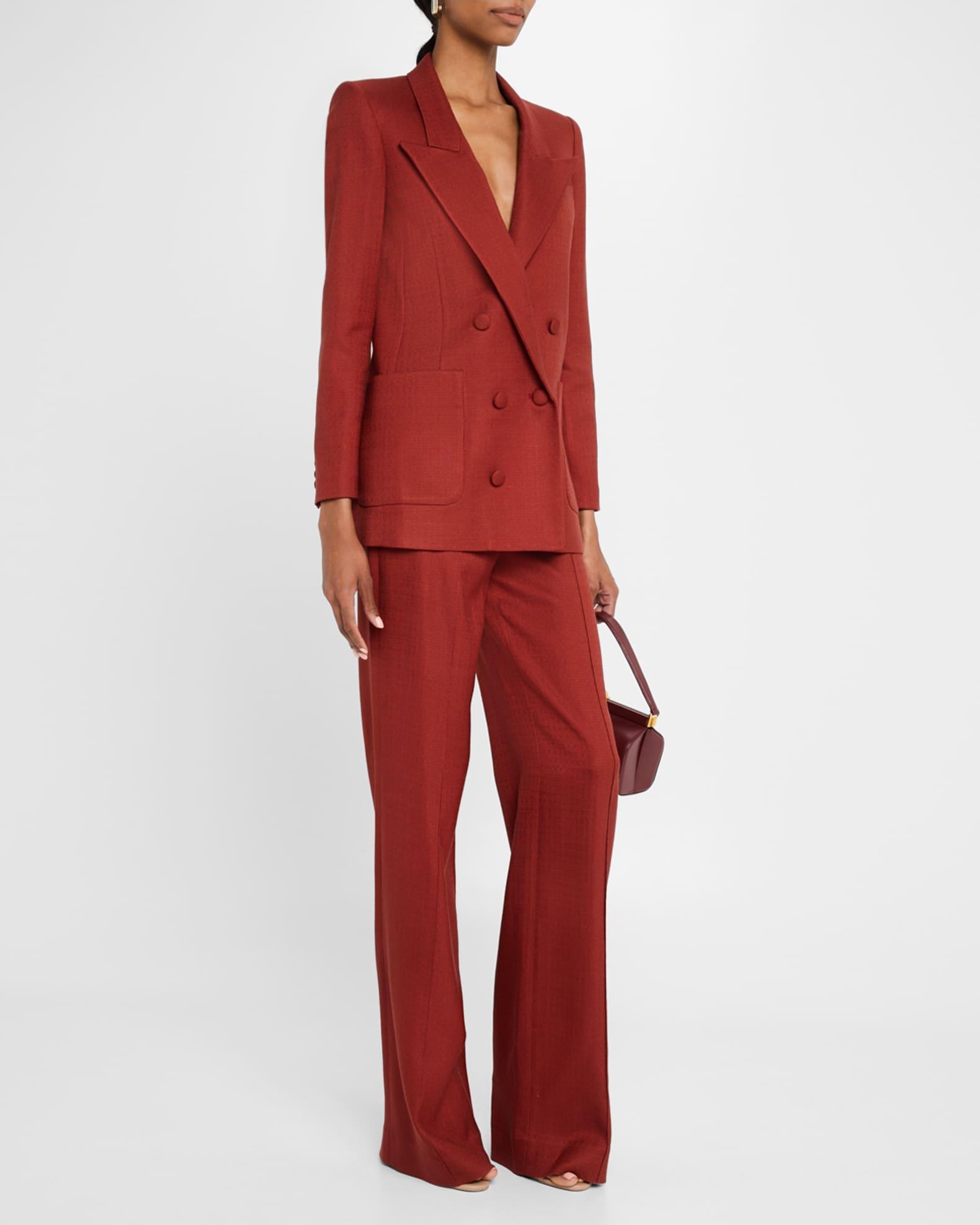 Adam Lippes "Riva" jacket in stretch canvas Peak lapels; double-breasted front Long sleeves; button cuffs Padded shoulders Chest welt pocket Hip patch pockets Tailored fit Hem falls below the hip Center-back vented hem Viscose/elastane Dry clean Made in USA