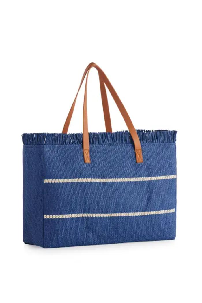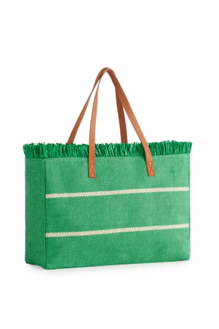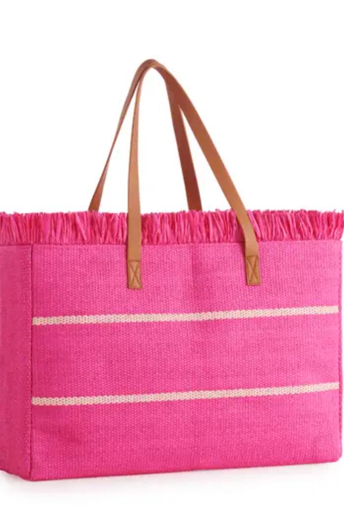 Paper Straw; Double Shoulder Straps; Top Zip Closure; 1 Inner Slip Pocket. The Riva Tote Is Your Chic, Oversized Companion For Those Sun-Soaked Beach Days Or Stylish Weekend Adventures. Crafted From Durable Woven Paper Straw, This Tote Features Playful Fringe Detailing Along The Edges and Classic Striped Accents For That Relaxed Yet Elevated Vibe. Its Roomy Interior Has Space For All Your Essentials – Towels, Books, Snacks, and Sunscreen – While The Comfy Faux Leather Straps Make It Easy To Carry Wherever You Wander.