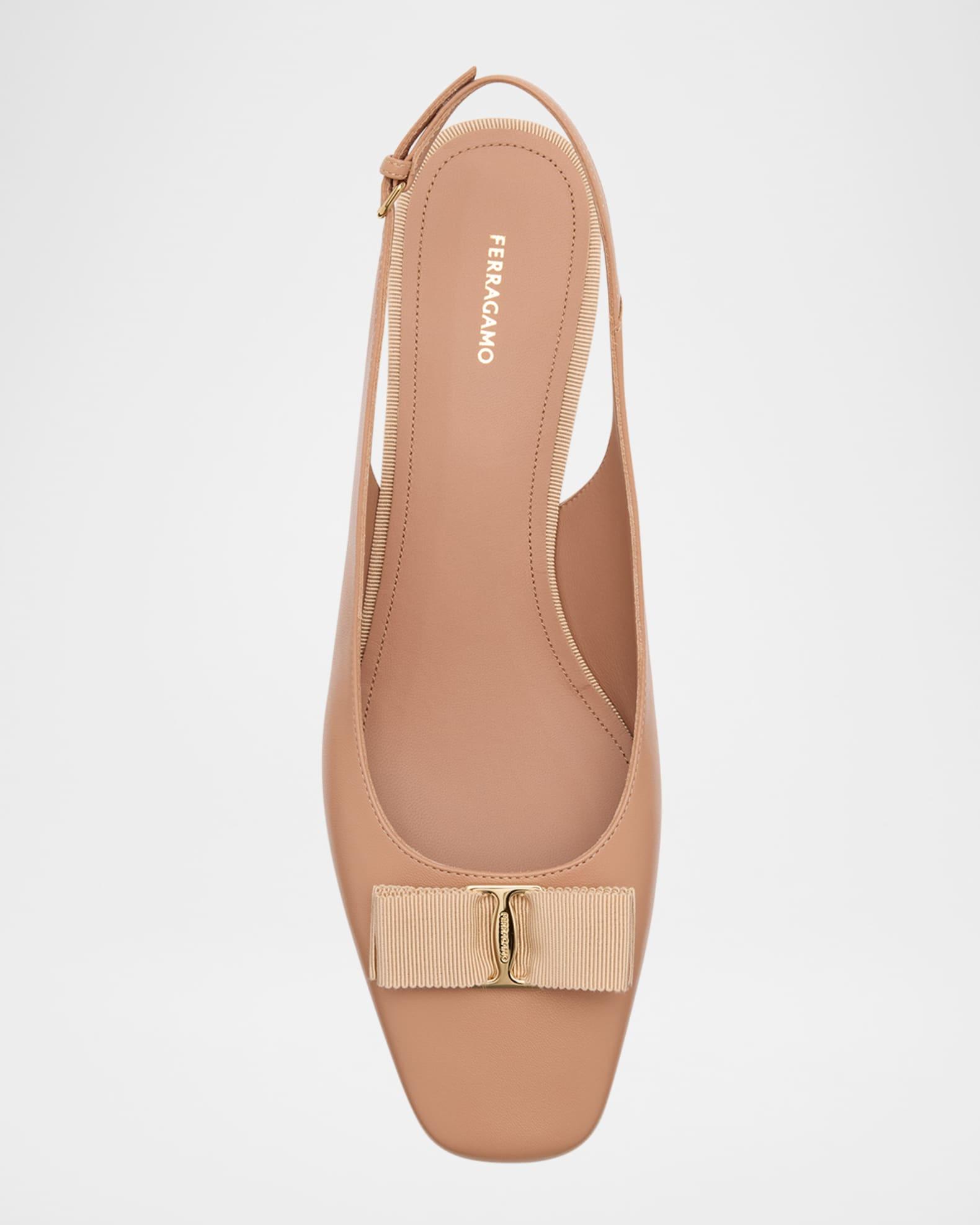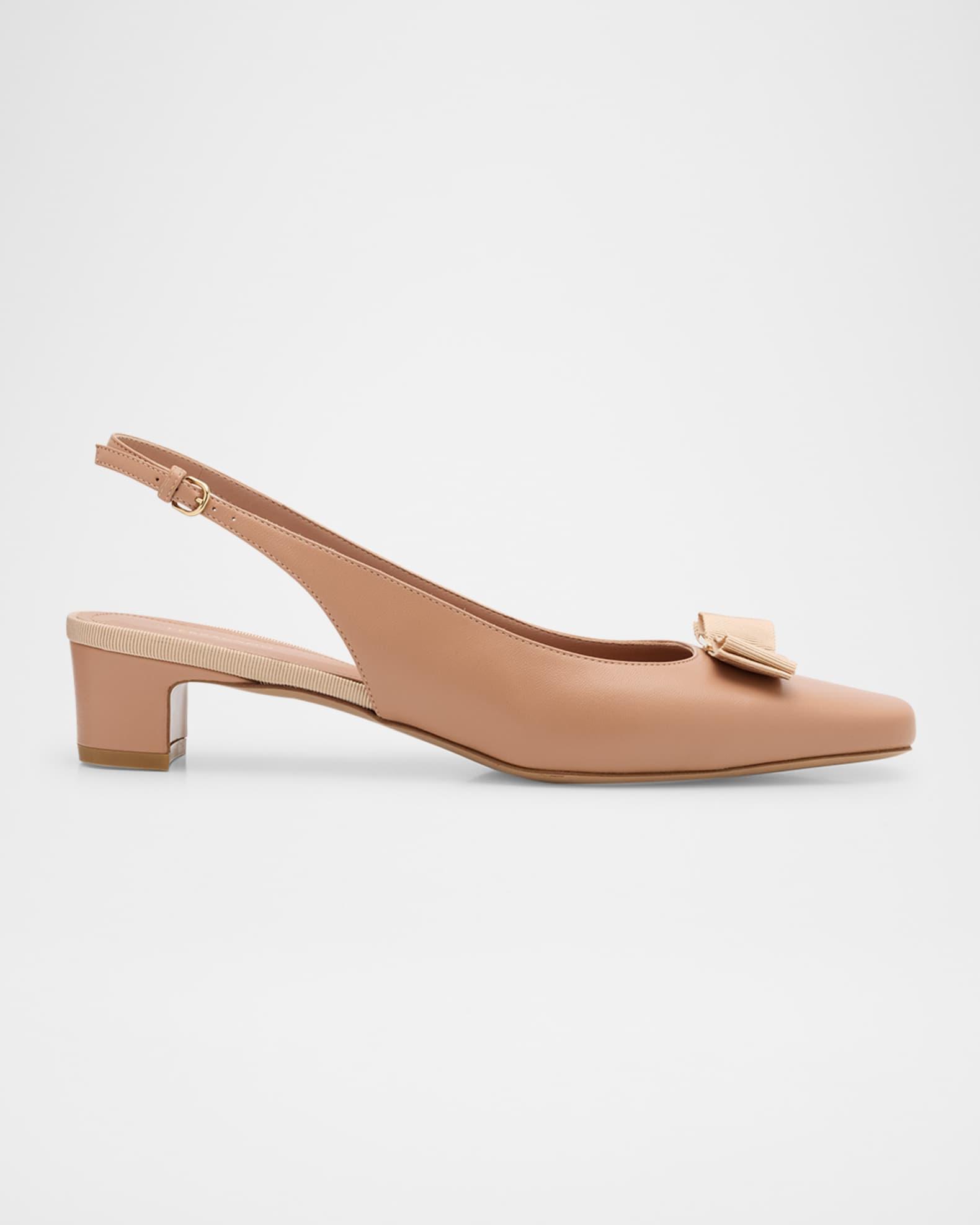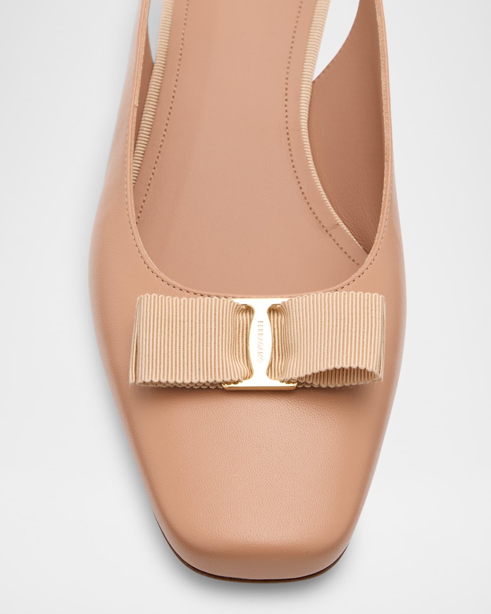 Ferragamo "Rivada" lambskin leather pumps are new contemporary icon; this chic slingback is simply perfect for the modern lady. With a low heel and elasticated slingback strap, the fit is easy and comfortable, while the leather insole and covered heel match the color of the grosgrain bow, held by a slim signature buckle at the tip. 1.25 in / 30 mm block heel Square toe Adjustable slingback strap Leather outsole Lining: Goat leather Professional cleaning recommended Made in Italy