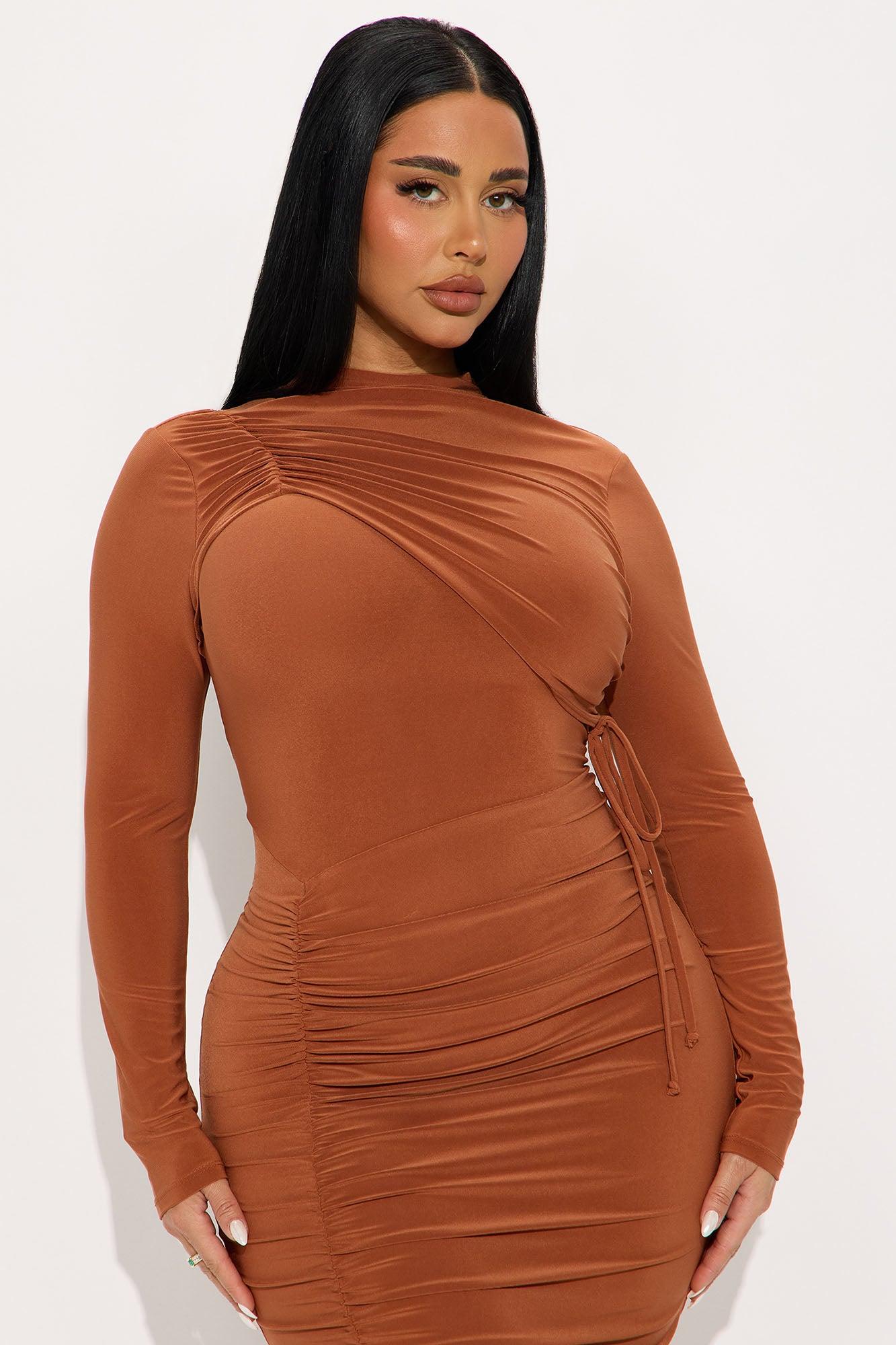 Available In Camel And Red. Midi Dress High Neck Long Sleeve Ruched Drawstring Keyhole Back Stretch Length Measured Flat = 40" Self: 95% Polyester 5% Spandex Imported California Proposition 65WARNING: Cancer and Reproductive Harm - www.P65Warnings.ca.gov.
