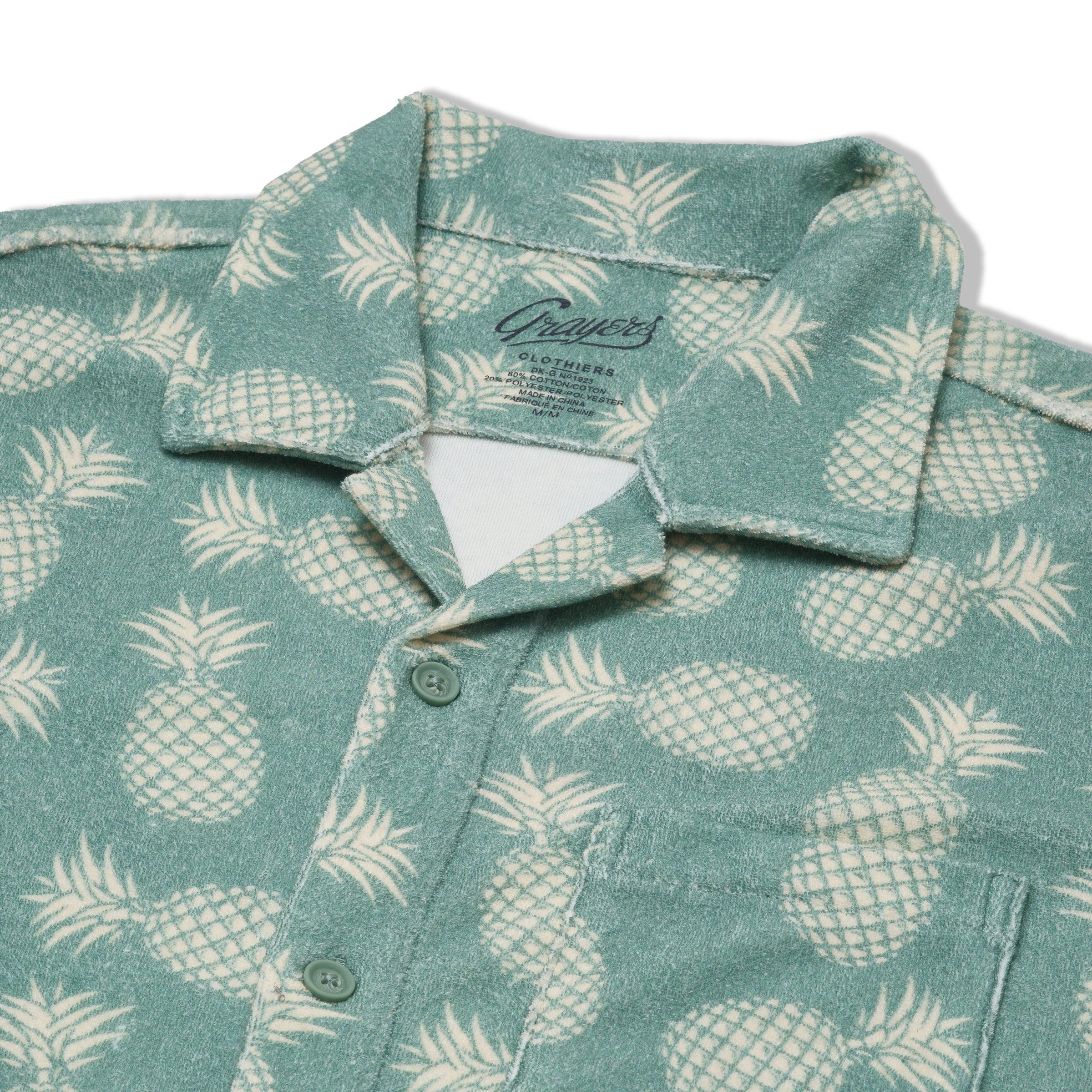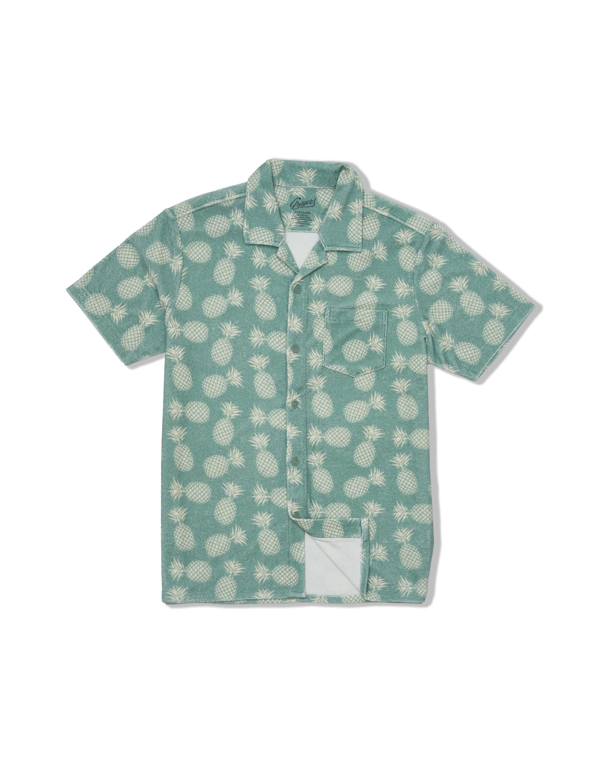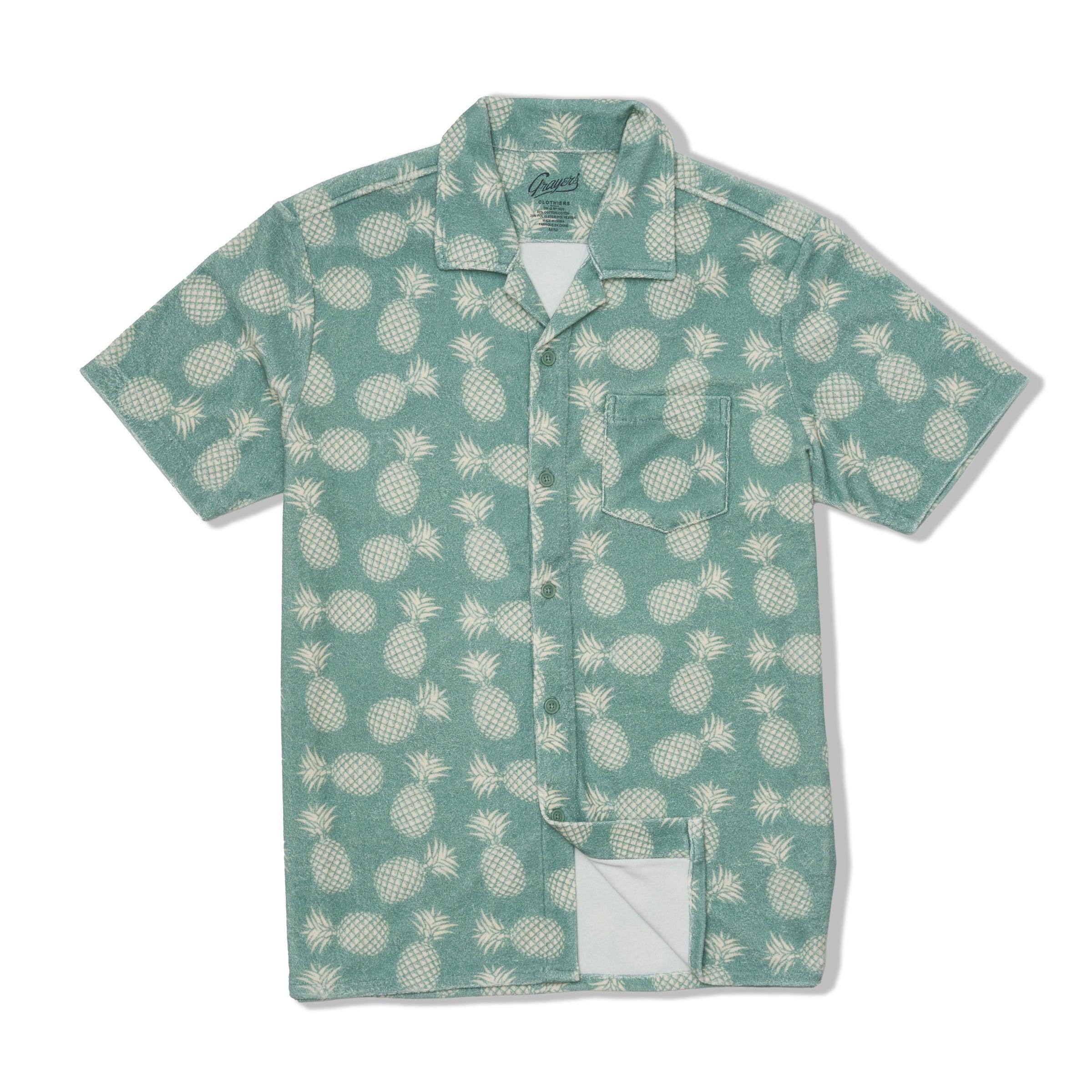 The unofficial uniform of tiki lounges, poolside hustlers, and late checkouts. The Riviera Terry Button Front Shirt takes everything you love about vintage cabana style and dials it up to piña colada levels. Cut from soft, breathable all-cotton French terry—yes, towel fabric, but chic—it features bold, cheeky 1960s-inspired prints that practically come with a cocktail. Finished with a camp collar, real buttons (for the commitment-phobes), and a nod to the jet-set scoundrels of the Côte d’Azur. Wear it open over a tee, buttoned up with chinos, or unbuttoned with a daiquiri. Bonus points if there’s a record player within arm’s reach. The Model is also wearing: Model: ----Details---- 100% cotton French terry Soft looped interior, smooth printed exterior Camp collar and full button front Retro tiki and palm-inspired artwork Cabana vibes encouraged Dyed to match buttons Patch pocket Straight hem Imported ----Materials---- 80% Cotton 20% Polyester ----Size & Fit---- Measuring Method: All measurements are in inches and based on a flat garment, as shown below. For comparison with one of your existing garments, please lay garment on a flat surface and follow the key measurement points. For chest and neck, if you double the flat measurement, you will get close to the full body measurement. ----Care---- Machine Wash Cold Separately Do Not Soak Before Washing Do Not Bleach Remove Promptly Tumble Dry Low Cool Iron If Necessary