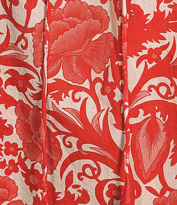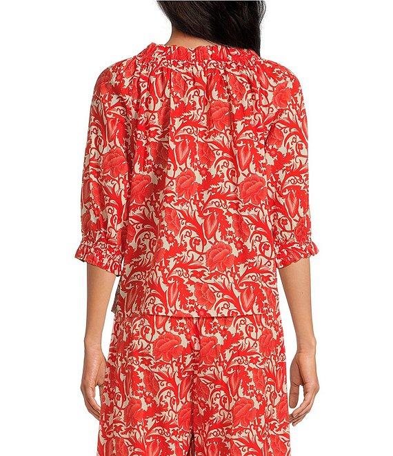 Ro's Garden Havana Woven Floral Print Round Ruffle Tie Neck 3/4 Puff Sleeve Blouse