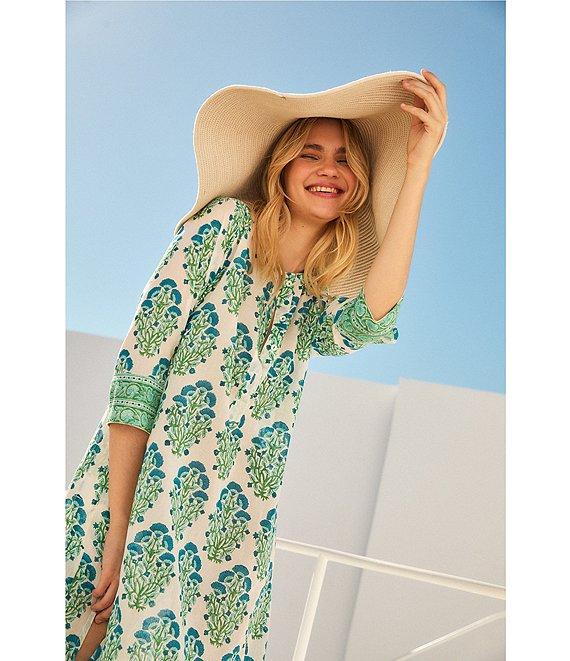From Ro's Garden, this dress features: Woven fabrication Raha blue print Round neckline 3/4 sleeves Side pockets Straight hem Pullover construction Approx. 50.5" length Cotton Hand wash Imported.