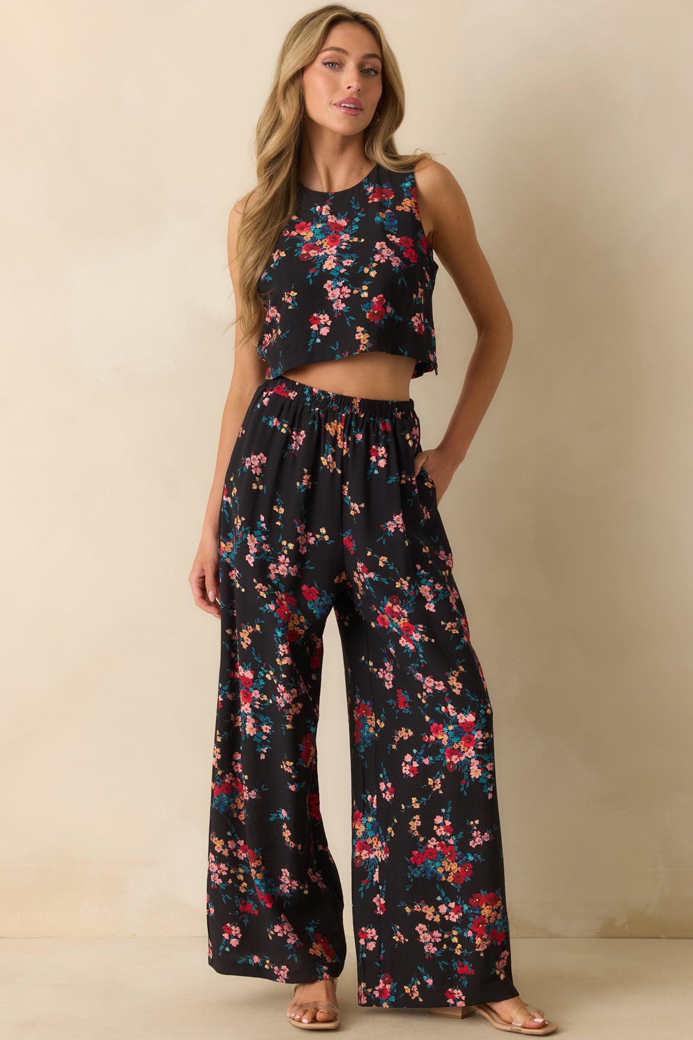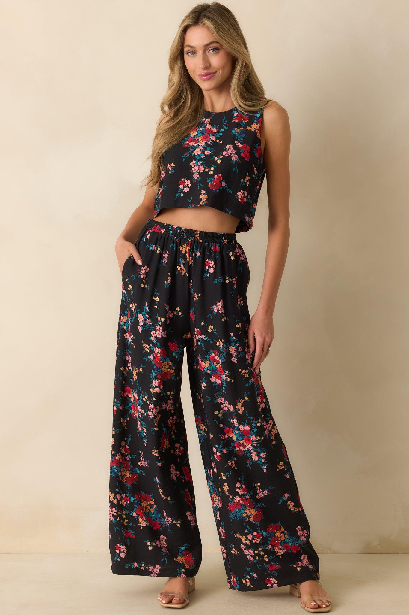 Wherever your day takes you, the Roam and Bloom Black Multi Floral Print Crop Top brings a touch of charm to every moment. With its open-back detail and easy cropped fit, it’s made for pairing with sunshine, slow mornings, and your favorite wide-leg pants. This black floral print crop top features a sleeveless design, round neckline, open-back cutout with a button closure, and lightweight woven fabric with a relaxed, cropped fit. 95% Rayon & 5% Nylon Lined: 100% Rayon Hand Wash Cold Manufactured in China Designed in The USA Model is 5'8" and is Wearing a Size Small