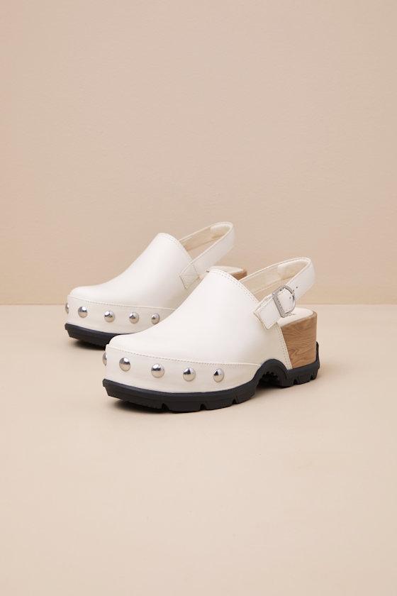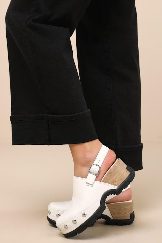 A prepared cutie like you will be ready for anything with the Sorel Roam'n Clog Chalk Leather Studded Slingback Clogs! Smooth genuine leather shapes these upgraded clogs that feature a classic rounded upper adorned with shiny silver studded details, all atop a trendy toe platform. The curved topline supports a slingback strap that secures with a silver buckle, while a sturdy, contrasting black lug sole lends an adventure-ready finish. Available in whole sizes only.