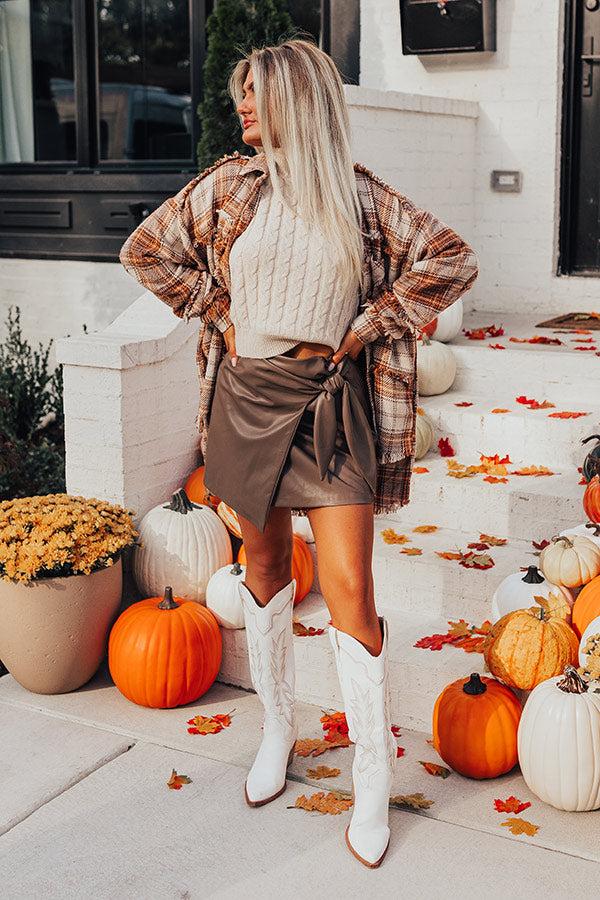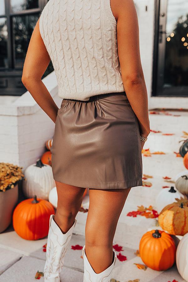 - We have the perfect chic skirt for your fall wardrobe! - Unlined faux leather material - A waistline with an elastic back detail - Interior side button closure - A wrap style front with side tie closure Measurements S : Hip 32", Length 16", Waist 26". M : Hip 34", Length 16.5", Waist 28". L : Hip 36", Length 17", Waist 30".