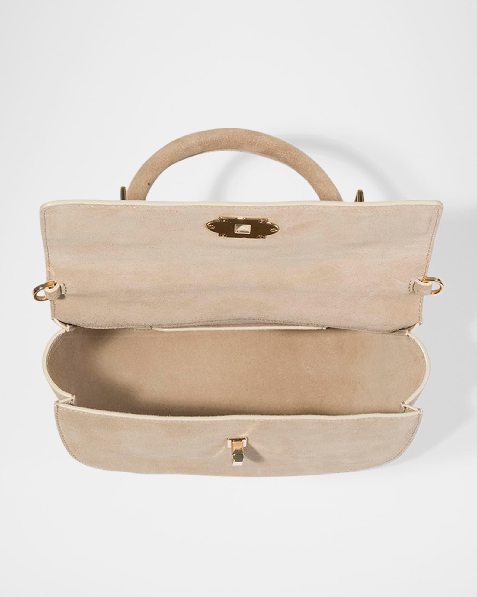 SIMKHAI "Roan" sculptural half moon-shaped crossbody bag in fine suede Rolled top handle Detachable, adjustable crossbody strap Can be worn as a top handle or crossbody bag Flap top with turn-lock closure Lining: Suede Approx. 10.4"H x 8.1"W x 4"D Imported