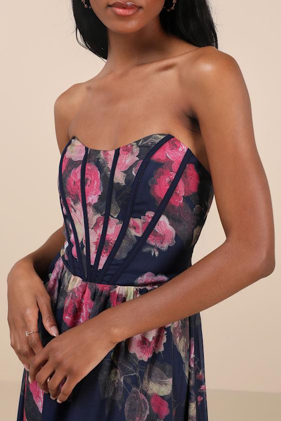 Whether you're the maid of honor or guest of honor, you'll be well prepared for your role with the Lulus Roane Navy Floral Organza Bustier Maxi Dress! Floral print-adorned organza shapes this lovely gown that features a bustier-inspired bodice with a strapless design, supportive boning, and hidden no-slip strips. The fitted waist sits atop a flowy A-line skirt with a drop tier seam and a sweeping maxi hem. Hidden back zipper/clasp.