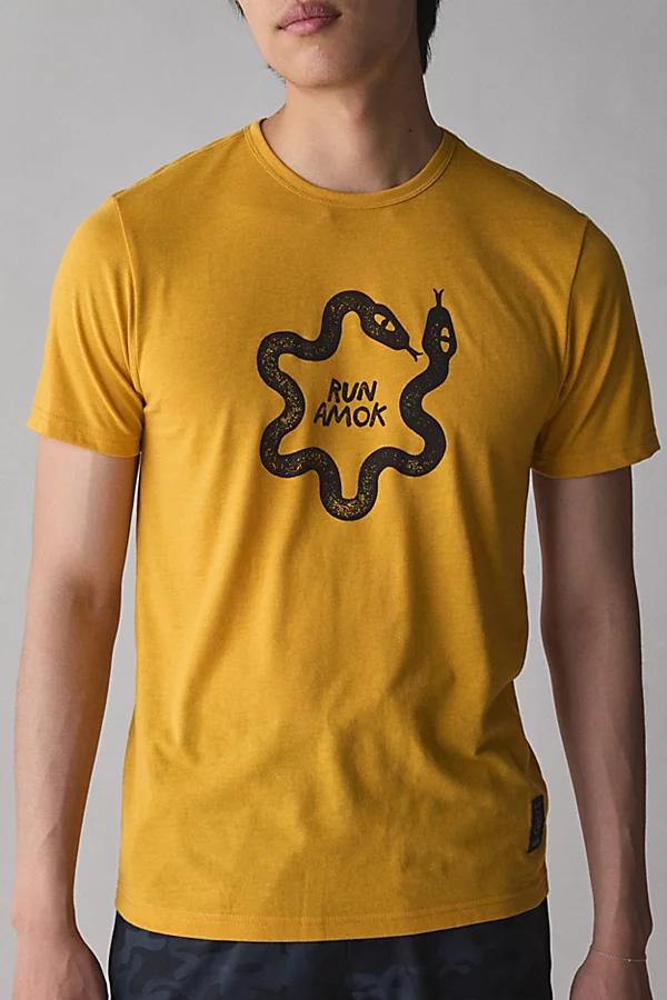 Make strides in this casual, athletic t-shirt by Roark from the active Run Amok collection. Running tee with a graphic print at the front. Features Roark Run Amok Mathis active graphic tee Graphic print running t-shirt Crew neck Graphic print Short sleeve Regular fit Content + Care 85% Polyester, 15% cotton Machine wash Imported Size + Fit Model in Ivory is 62 and wearing size Medium Measurements taken from size Medium Chest: 38 Length: 27 Roark Run Amok Mathis Active Graphic Tee in Dark Yellow, Mens at Urban Outfitters
