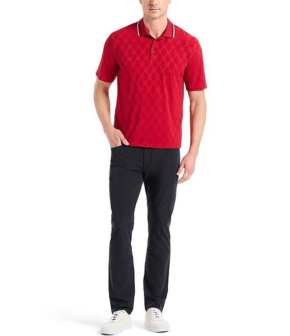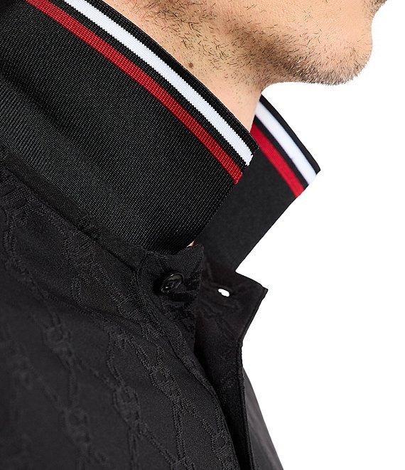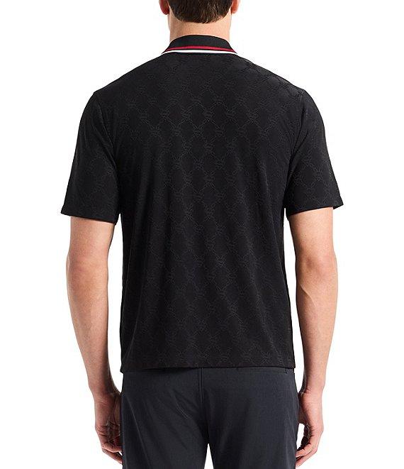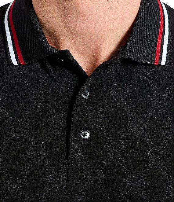 From Robert Graham, this polo shirt features: Tonal S-Shield "Superman" logo printed allover Ribbed polo collar with tipping Short sleeves 3-button placket "Superman" collage print on inside yoke Pullover construction Stretch fabric Polyester/spandex Machine wash/tumble dry Imported.
