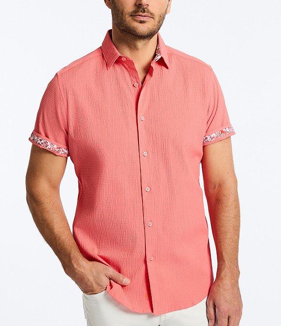 From Robert Graham, this shirt features: Solid tone Point collar Short sleeves Contrast detail under collar and sleeves Button-front closure Shirttail hem Stretch seersucker fabric Cotton/spandex Machine wash/tumble dry Imported.