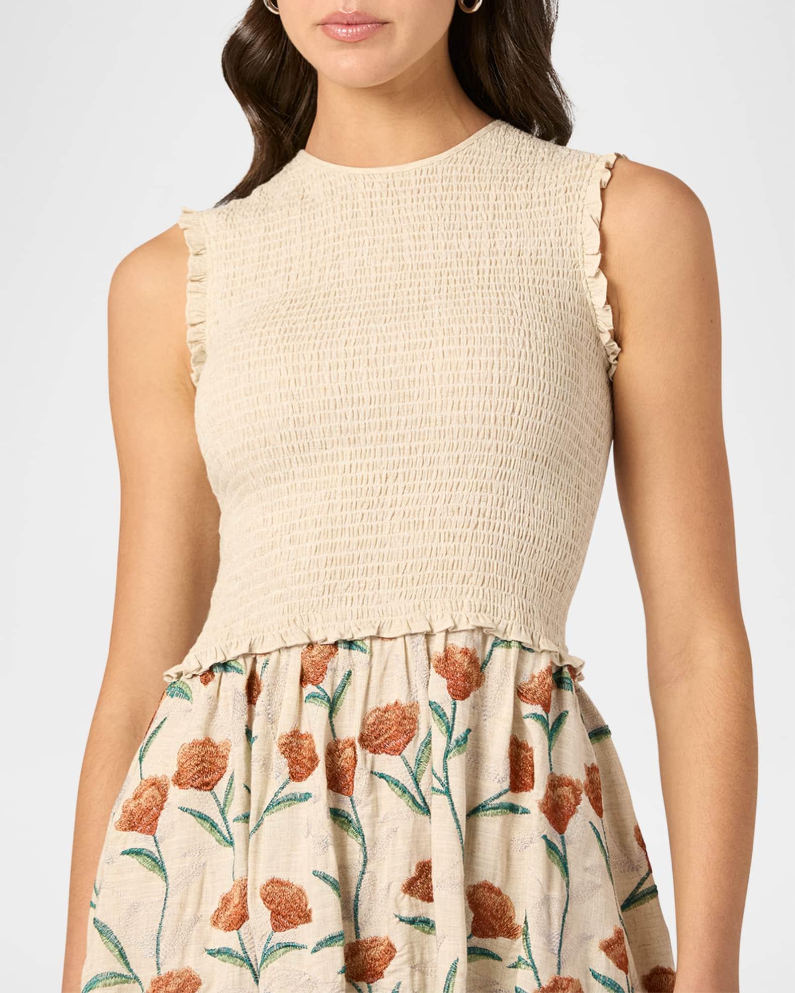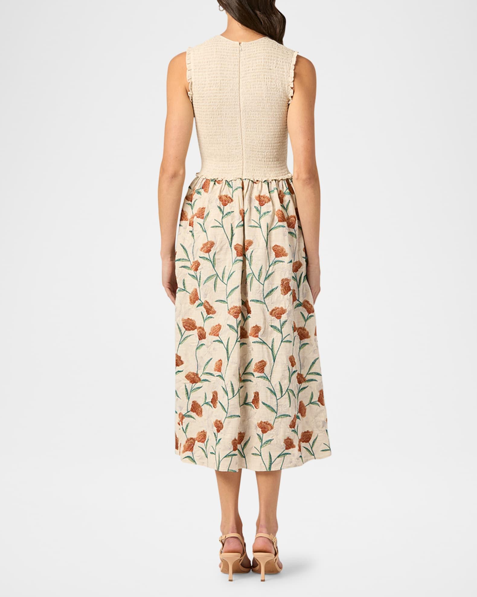 Featuring a figure-hugging smocked bodice, the "Roberta" midi dress from Shoshanna is detailed with floral embroidery and ruffle trim Approx. 53"L from shoulders to hem Jewel neckline Sleeveless Hem falls below the knee A-line silhouette Invisible back zipper Rayon/cellulose acetate/spandex Dry clean Imported
