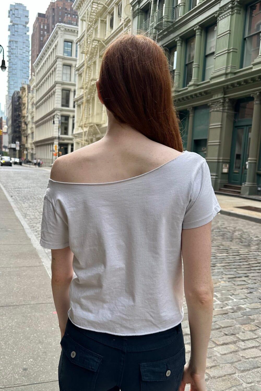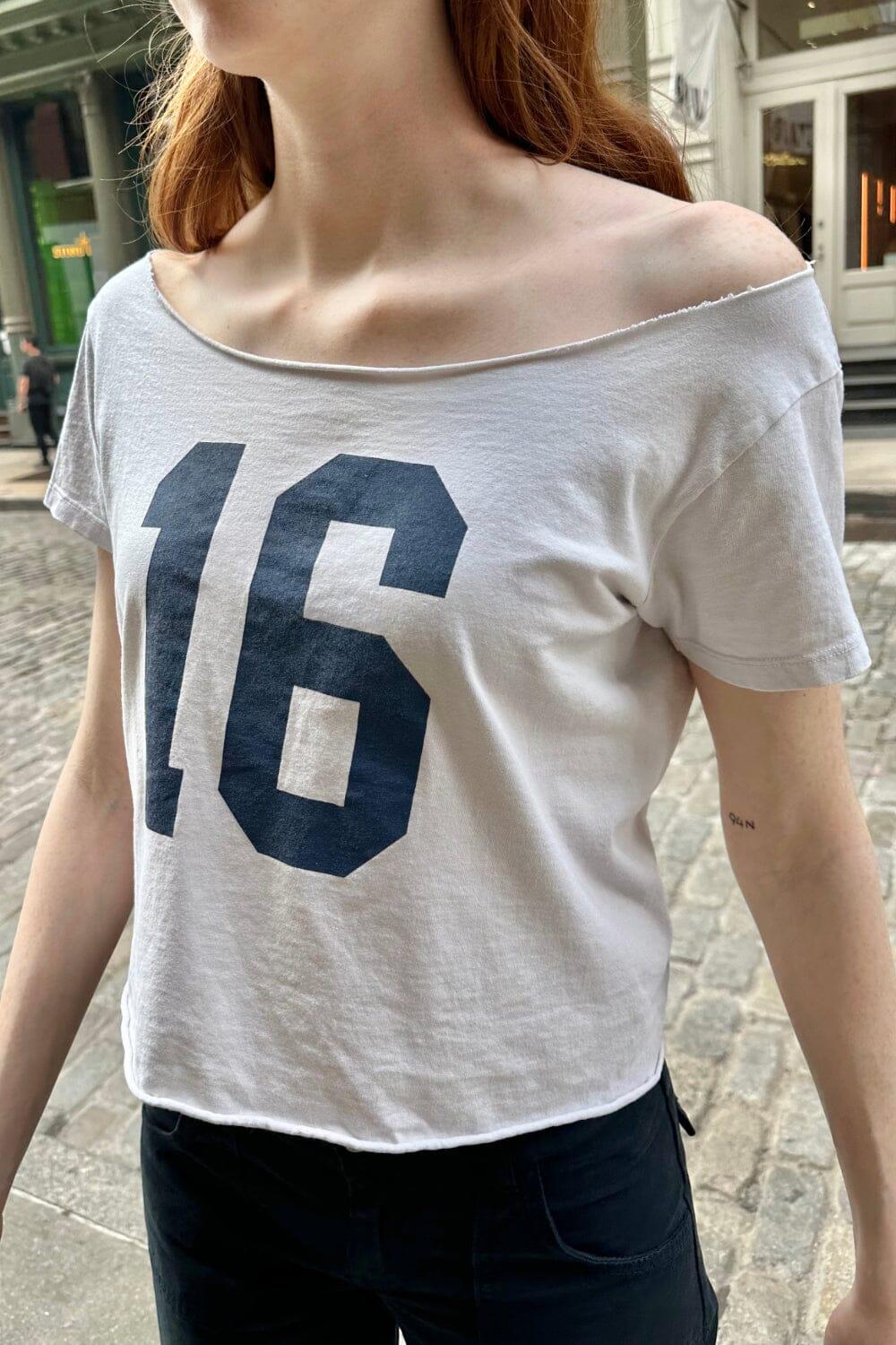 Soft and lightweight cropped wideneck cotton top with raw hem in off white, with the 16 graphic printed on the front in faded navy blue. Fabrics: 100% cotton Measurement: 21" (54 cm) length, 18" (46 cm) bust Made in: Europe