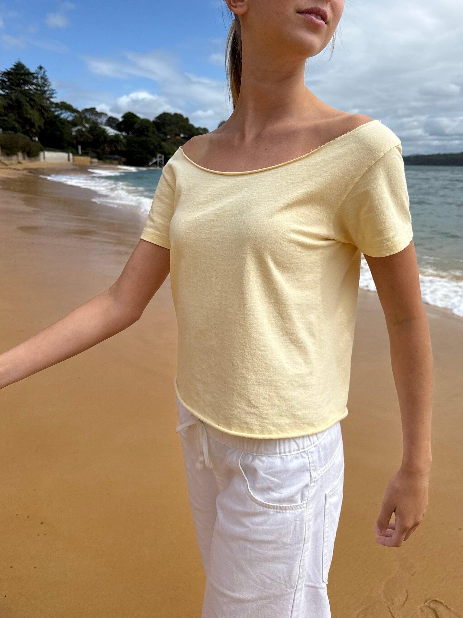 Soft and lightweight cropped wide neck, off the shoulder cotton top with raw hem in pastel yellow.. Fabrics: 100% cotton Measurement: 21" (54 cm) length, 18" (46 cm) bust Made in: Europe
