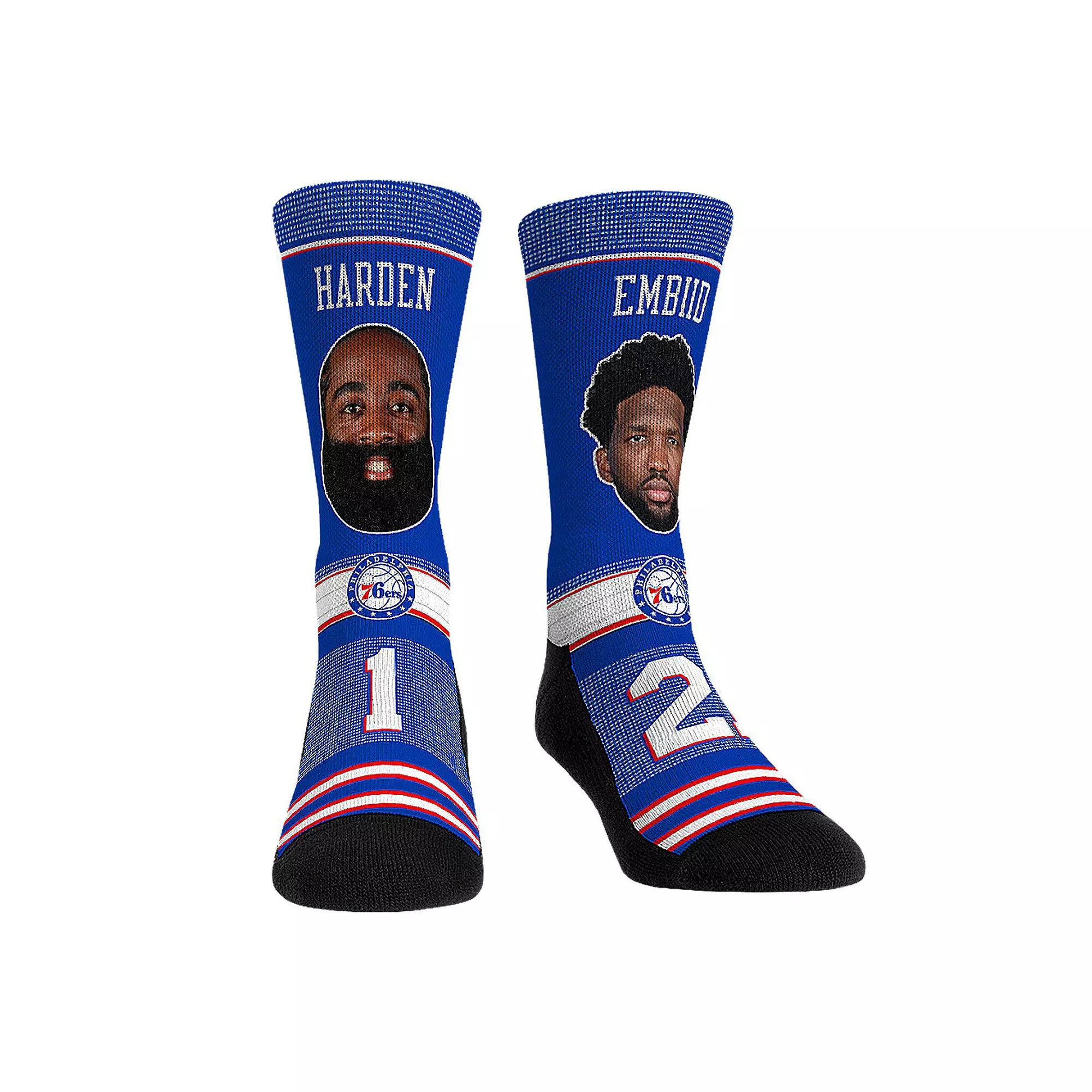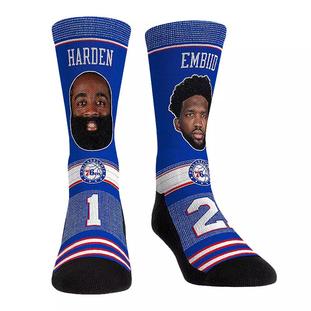 Showcase your unwavering love for your favorite dynamic duo when you rock these Player crew socks. Rock Em Socks designed them with a breathable construction and padded soles to keep you comfortable as you cheer on the Philadelphia 76ers. On top of that, they feature vibrant Philadelphia 76ers colors and graphics that let everyone know youre ready to see James Harden and Joel Embiid hit the hardwood.Showcase your unwavering love for your favorite dynamic duo when you rock these Player crew socks. Rock Em Socks designed them with a breathable construction and padded soles to keep you comfortable as you cheer on the Philadelphia 76ers. On top of that, they feature vibrant Philadelphia 76ers colors and graphics that let everyone know youre ready to see James Harden and Joel Embiid hit the hardwood.PRODUCT FEATURESBrand: Rock Em SocksImportedOfficially licensedSublimated graphicsMachine wash, tumble dry lowBreathable constructionSeamless toeWoven graphicsFormed heelPadded sole and toe boxForm-fit bandMaterial: 62% Polyester/32% Cotton/4% Natural Latex Rubber/1% Spandex/1% Nylon Size: L/XL. Color: Multicolor. Gender: male. Age Group: adult.
