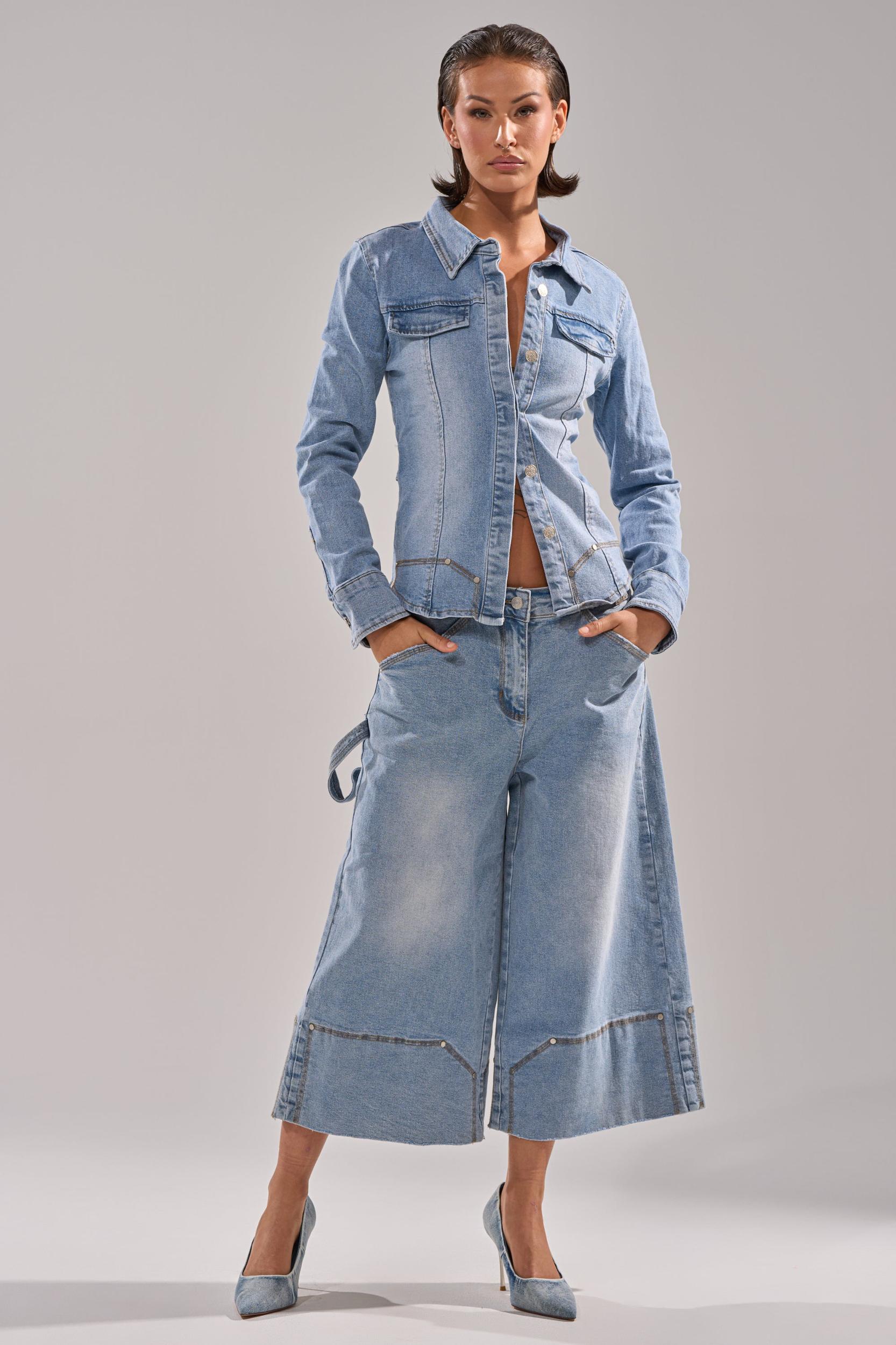 The AKIRA Label Rock My World Wide-Leg Denim Bermuda Shorts bring a fresh twist to classic denim with their relaxed yet refined silhouette. Crafted from structured light blue denim, these oversized, relaxed-fit shorts feature wide legs, contrast stitching with a matte silver stud embellishments, and utilitarian pocket detailing for a subtle workwear-inspired edge. Complete with functional belt loops and a zip-button front fly, they pair perfectly with the complementary Rock My World Denim Button Down. - 99% Cotton, 1% Spandex- Slight Stretch- Imported (all measurements approximate from size small)- 11” Rise- 20” Inseam- Model is 5’7” and wearing a size smallProduct ID: 1064151 (all measurements approximate from size 1X)- 14” Rise- 20” InseamProduct ID: 1064155