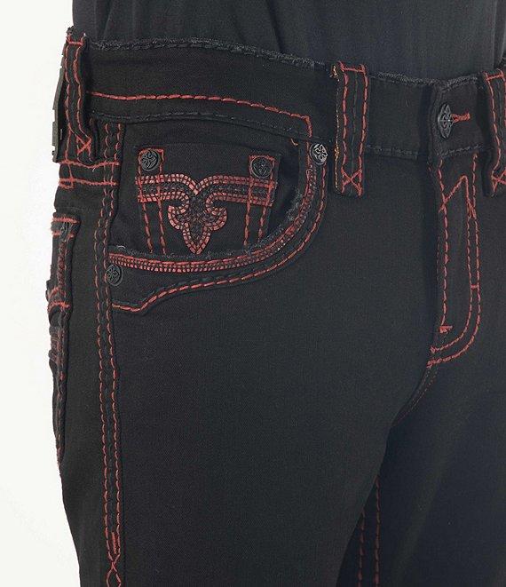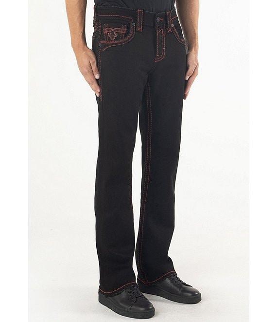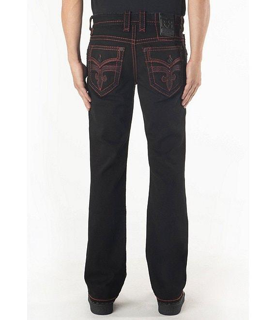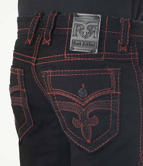 From Rock Revival, these jeans feature: Straight legs Zip/button-front closure 2 front pockets; one with coin pocket Rock revival classic reversed Fleur De Lis on back pockets Straight custom matt black hardware throughout Black on black straight cut jeans Faux-leather belt loop patch 32" inseam Cotton/elastane denim Machine wash/tumble dry Imported.
