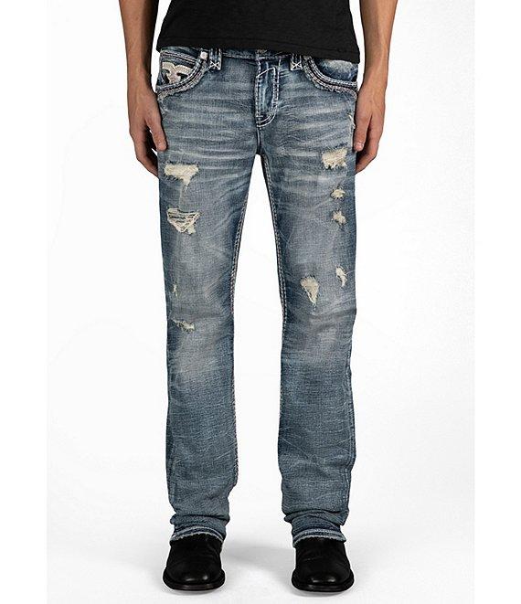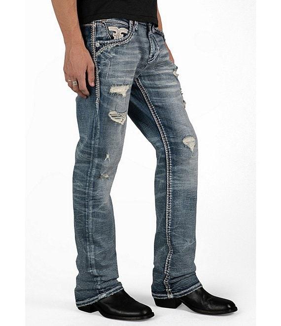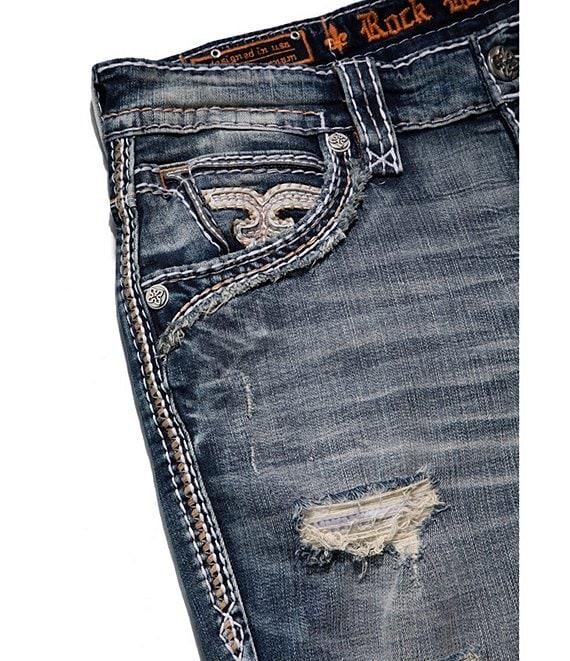 From Rock Revival, these jeans feature: Mid rise Belt loops Zip/button-front closure Tan stitching detail 2 front pockets (1 with fleur-de-lis embroidery on the coin pocket) 2 back pockets with contrasting fleur-de-lis embroidery Engraved 'Rock Revival' leather waist patch 32" inseam Oversized legs Cotton/elastane stretch denim Machine wash/tumble dry Made in the USA.