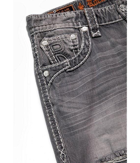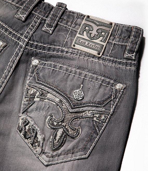 From Rock Revival, these jeans feature: Mid rise Belt loops Zip/button-front closure Grey stitching detail 2 front pockets (1 with fleur-de-lis embroidery on the coin pocket) 2 back pockets with contrasting fleur-de-lis embroidery Engraved 'Rock Revival' leather waist patch 32" inseam Straight legs Cotton/elastane stretch denim Machine wash/tumble dry Made in the USA.