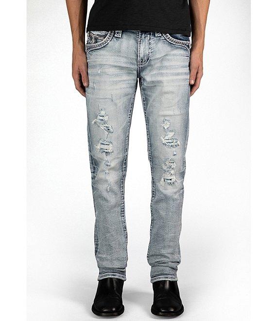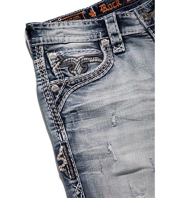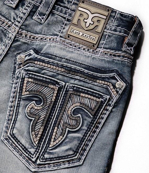 From Rock Revival, these jeans feature: Mid rise Belt loops Zip/button-front closure Grey stitching detail 2 front pockets (1 with fleur-de-lis embroidery on the coin pocket) 2 back pockets with contrasting fleur-de-lis embroidery Engraved 'Rock Revival' leather waist patch 32" inseam Straight legs Cotton/elastane stretch denim Machine wash/tumble dry Made in the USA.