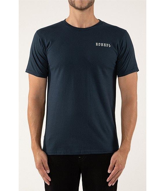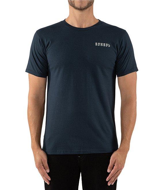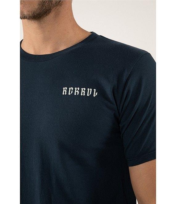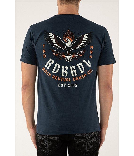 From Rock Revival, this t-shirt features: Crew neckline Short sleeves Iconic "RCKRVL" logo on the left side of the chest Large "RCKRVL" logo, an eagle and other verbiage screen printed on the back Pullover construction Cotton Machine wash/tumble dry Imported.